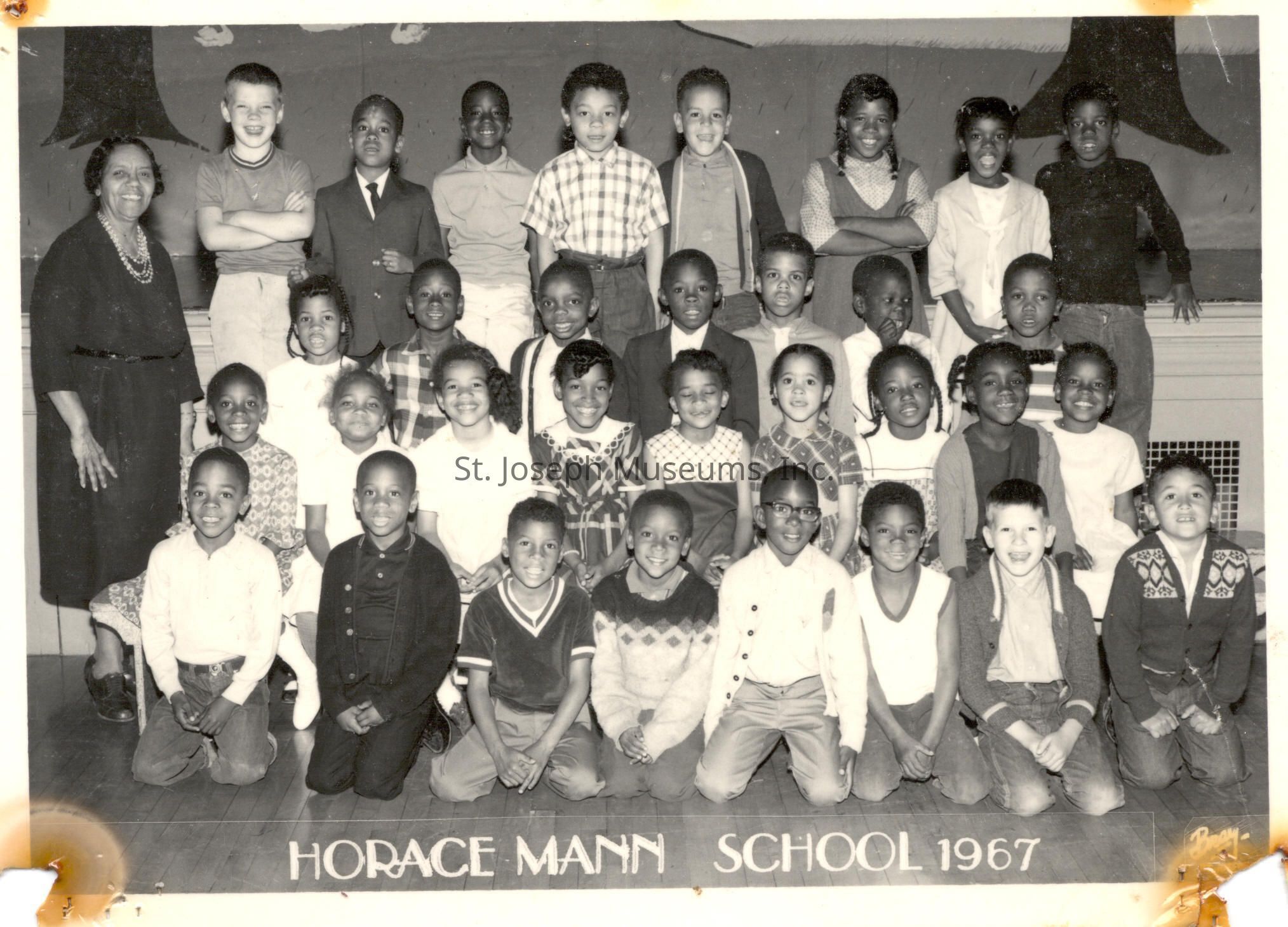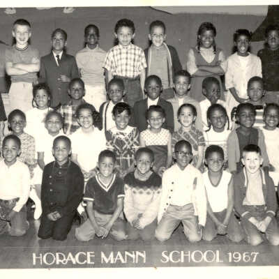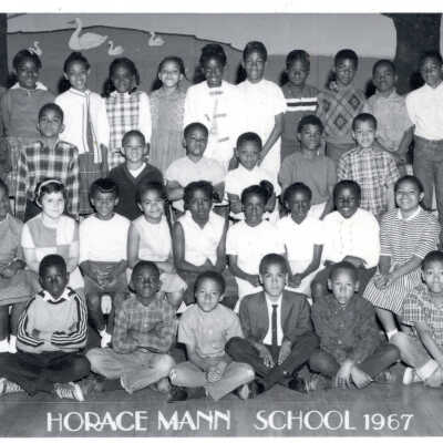 Photo #1: 33 students and teacher, perhaps 3rd or 4th grade. Only one white child shown. At bottom: Horace Mann School, 1967