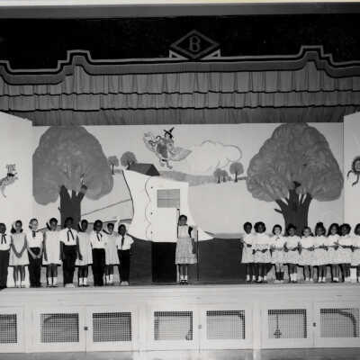 Photo #4: School program photo. Group of students on stage with props. In middle is Shoe (as in old lady in the shoe). Mother Goose, Cat & Fiddle, Dish running away with spoon are all drawn on backdrop. The "B" for Bartlett School is still the crest over the stage. Girls are dressed in identical skirts/blouses. Boys are in white shirts with bow ties with long tails and dark pants.