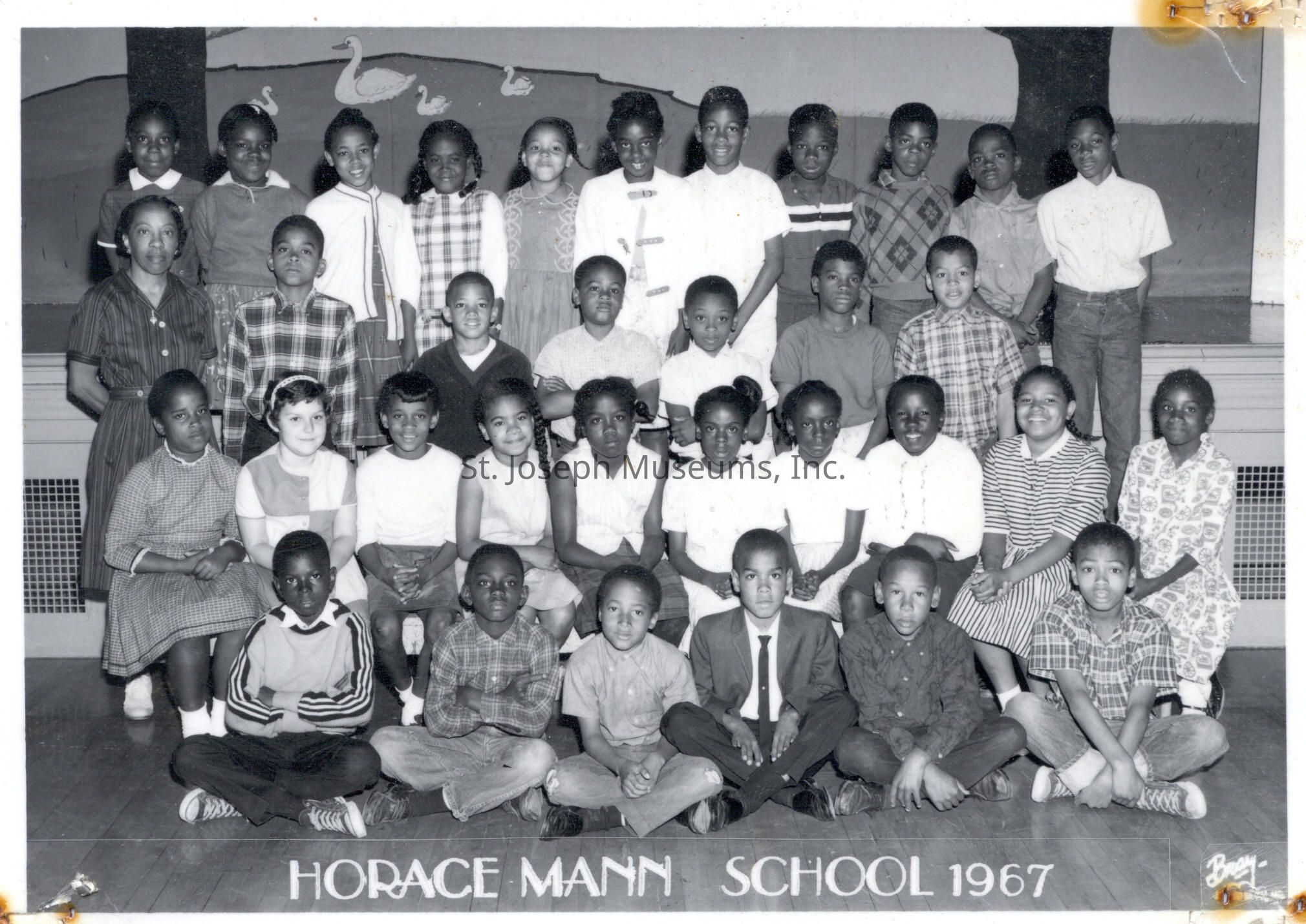 Photo #2: 32 students and teacher, perhaps 2nd grade. Only two white children in group. At bottom: Horace Mann School, 1967