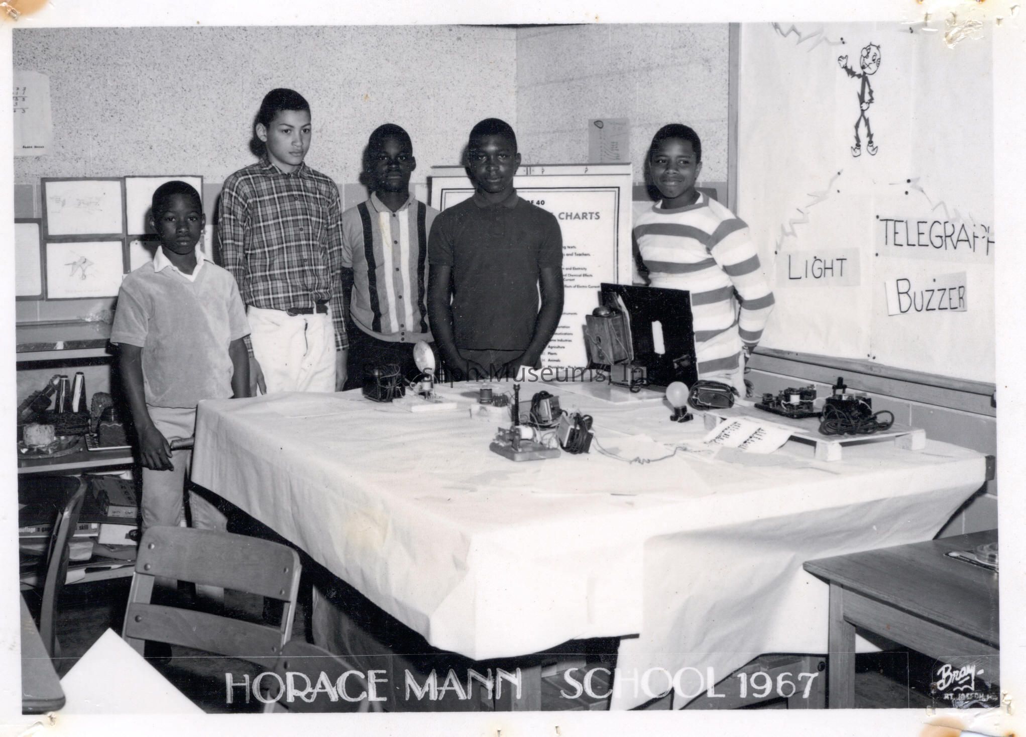 Photo #3: 5 black students around a cloth covered table with electricity experiments with light bulbs on it. Bulletin board in background has "Reddy Kilowatt" cartoon and Light, Telegraph, Buzzer written on poster. "Horace Mann School, 1967" at bottom and credit to Bray Photographers.