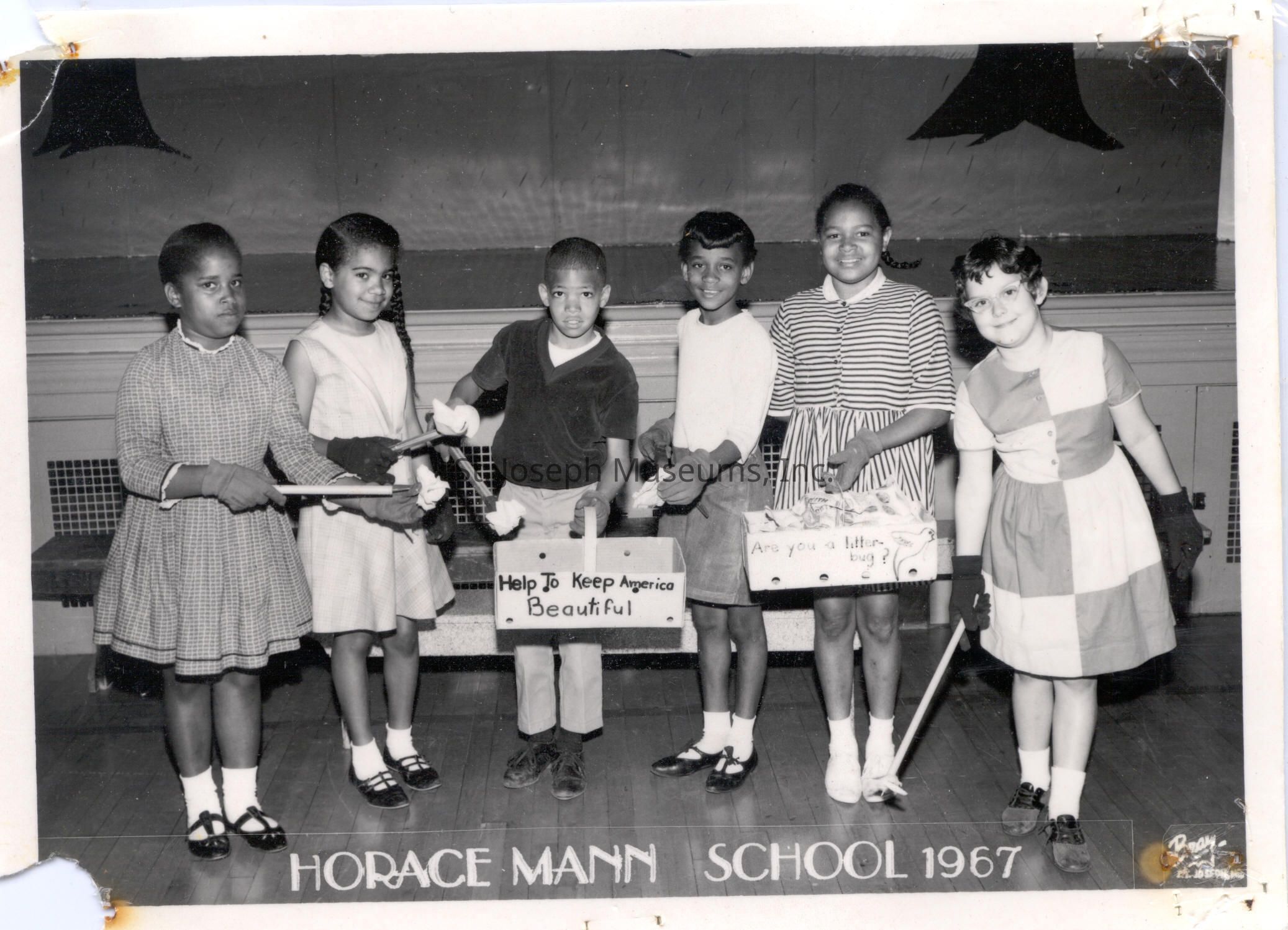 Photo #5: 6 students shown on gym floor in front of stage. The one boy is holding a basket labled "How to Keep America Beautiful" . A girl is holding a similar basket labeled "Are You a Litter Bug?" The students have grabber sticks with paper and are putting them in the basket. Of the 6 students only one is white.