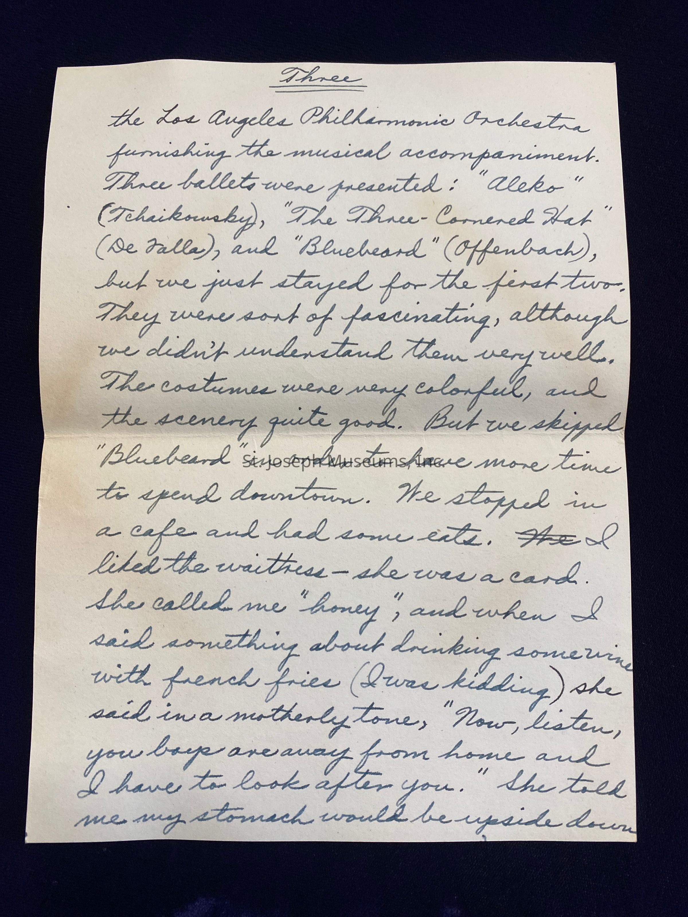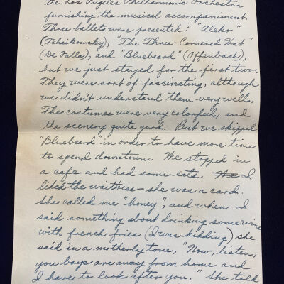 Servicemen, we were admitted free to the Hollywood Bowl, although we had to sit fairly close to the top. To me it didn't seem much larger or nicer than the Krug Park Bowl. Of course there are seats from the very bottom to the top of the Hollywood Bowl. The program last night consisted of the Russian Ballet, with Los Angeles Philharmonic Orchestra furnishing the musical accompaniment. Three ballets were presented: "Aleko" (Tchaikowsky), "The Three-Cornered Hat" (DeFalla), and "Bluebeard" (Offenbach), but we just stayed for the first two. They were sort of fascinating, although we didn't understand them very well. The costumes were very colorful, and the scenery quite good. But we skipped "Bluebeard" in order to have more time to spend downtown. We stopped in a cafe and had some eats. I liked the waitress - she was a card. She called me "honey," and when I said something about drinking some wine with french fries (I was kidding) she said in a motherly tone, "Now, listen, you boys are away from home and I have to look after you." She told me my stomach would be upside down if I ate that combination. So I took coffee instead. She reminded me of Zazu Pitts. I think a lot of stage-struck nuts go to Hollywood to work to try to push themselves into the movies someway or other. ---We bought some peanuts and popcorn, walked the streets awhile, then crowded onto the very crowded bus back to Pasadena. I crawled into my bunk at 2:15 a.m., and got up this morning at 8:30 a.m.