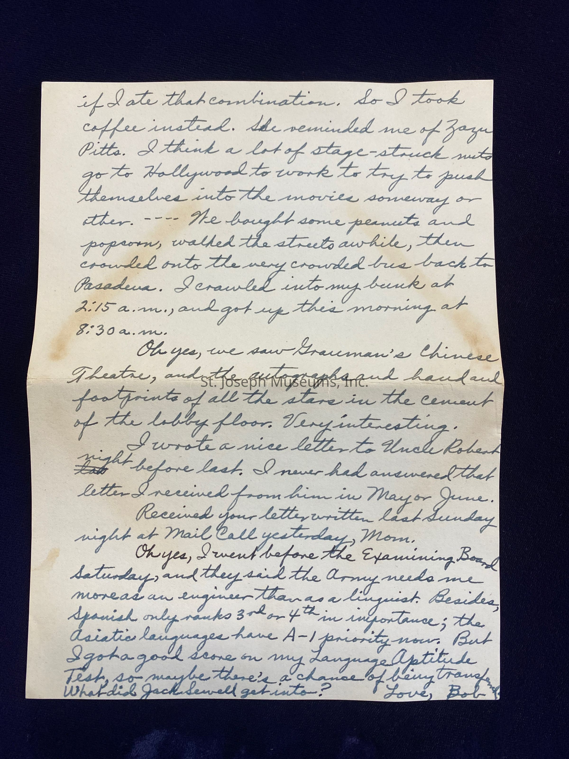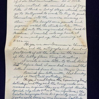 Handwritten letter home to parents back in St. Joseph after being called up to serve in the US Army during WWII. Pvt. Spalsbury, at the time of this letter, has completed Basic Training at Camp Callan, California and is serving in a STAR Unit for ASTP (Army Specialized Training Program) soldiers in Pasadena, CA.