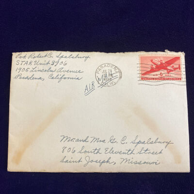 Letter Home from Pvt. Robert C. Spalsbury, STAR Unit 3906, 1905 Lincoln Avenue, Pasadena, California to his parents Mr. and Mrs. George C. Spalsbury, 806 South Eleventh Street, Saint Joseph, Missouri. Post Marked JUL 26 1943, Pasadena, Calif., 6 cent Air Mail stamp.