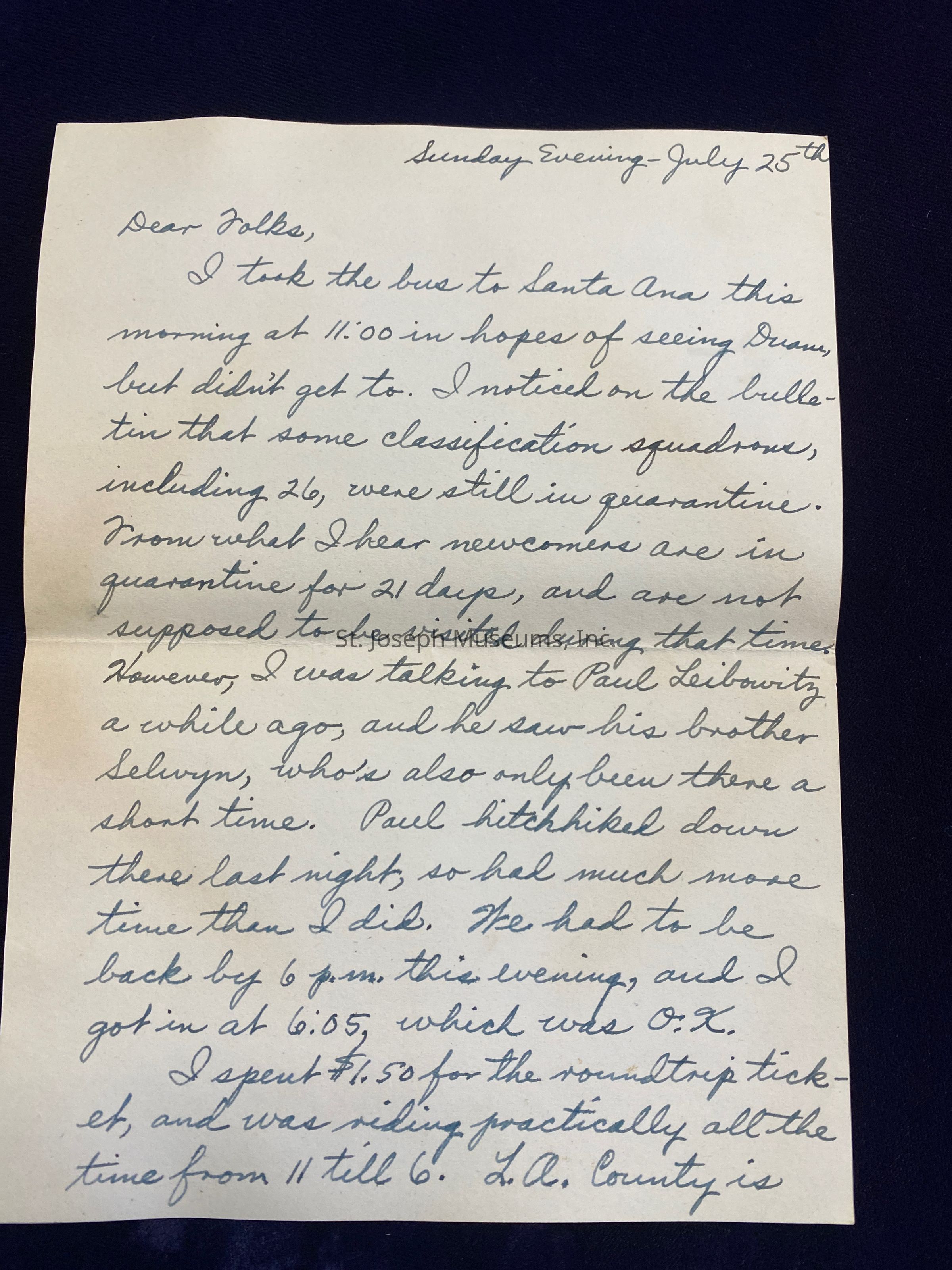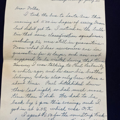 I took the bus to Santa Ana this morning at 11:00 in hopes of seeing Duane, but didn't get to. I noticed on the bulletin that some classification squadrons, including 26, were still in quarantine. From what I hear new comers are in quarantine for 21 days, and are not supposed to be visited during that time. However, I was talking to Paul Leibowitz a while ago, and he saw his brother Selwyn, who's also only been there a short time. Paul hitchhiked down there last night, so had much more time than I did. We had to be back by 6 p.m. this evening, and I got in at 6:05, which was O.K.