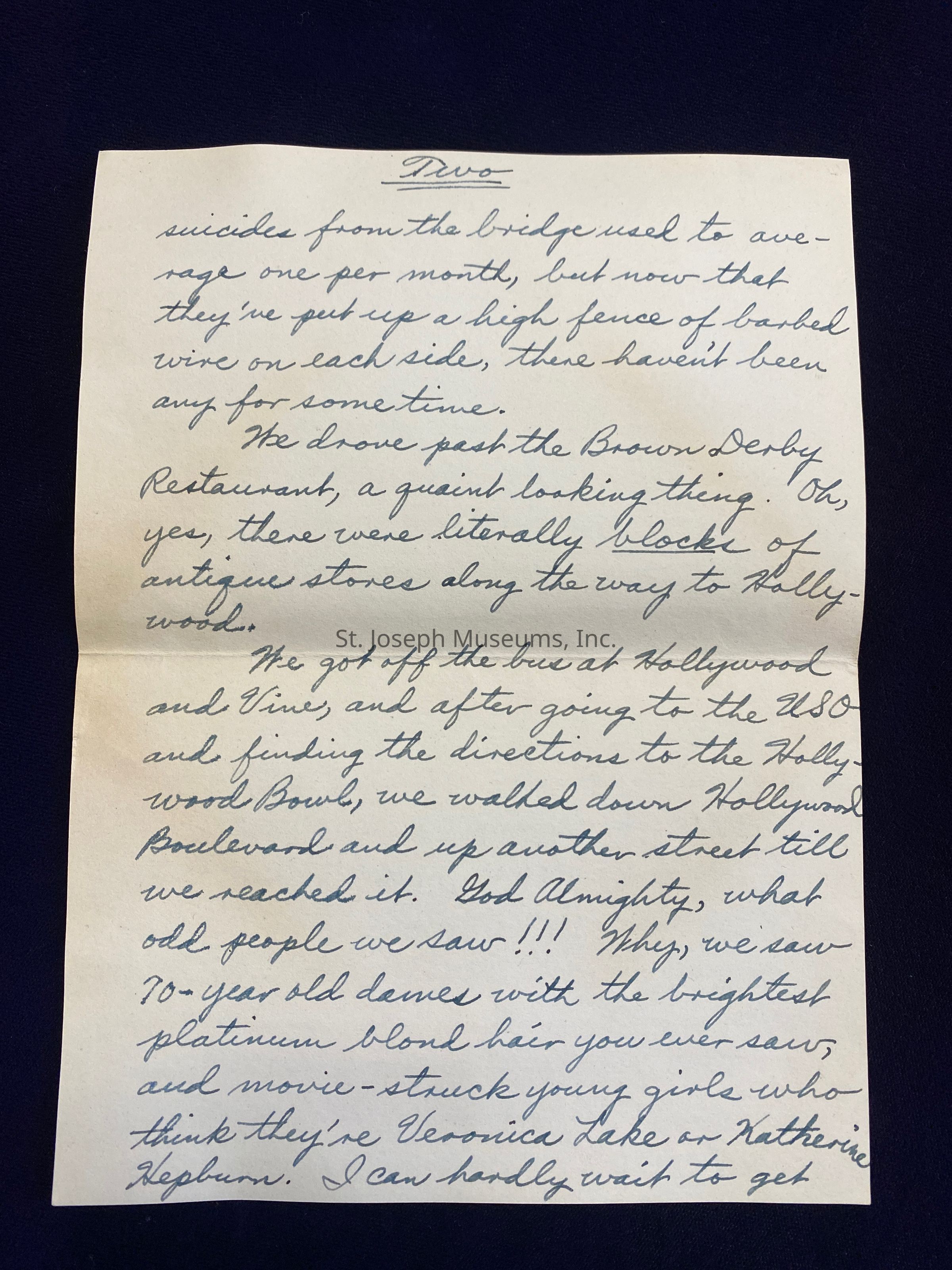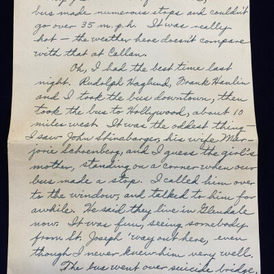 Oh, I had the best time last night. Rudolph Haglund, Frank Hanlin and I took the bus downtown, then took the bus to Hollywood, about 10 miles west. It was the oddest thing - I saw John Shinabarger, his wife Margorie Schoenberg, and I guess the girl's mother, standing on a corner when our bus made a stop. I called him over to the window, and talked to him for awhile. He said they live in Glendale now. It was fun, seeing somebody from St. Joseph way out here, even though I never knew him very well.