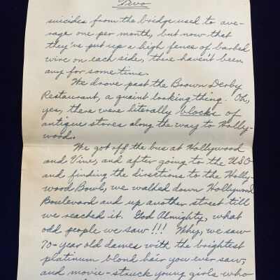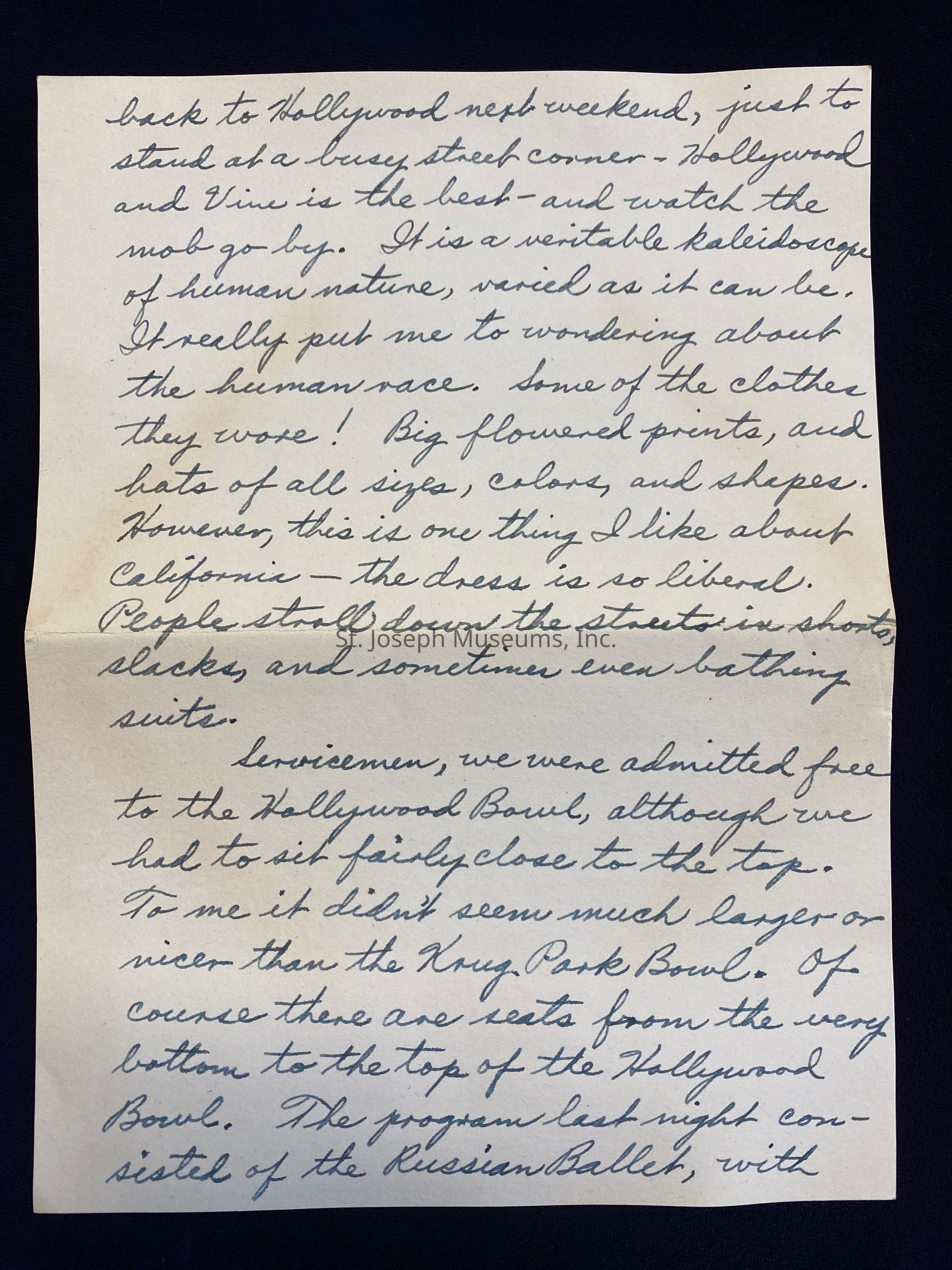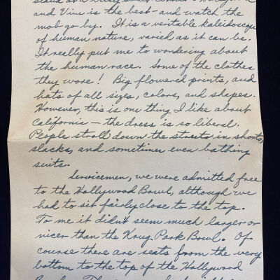 We got off the bus at Hollywood and Vine, and after going to the USO and finding directions to the Hollywood Bowl, we walked down Hollywood Boulevard and up another street till we reached it. God Almighty, what odd people we saw!!! Why, we saw 70-year old dames with the brightest platinum blond hair you ever saw, and movie -struck young girls who think they're Veronica Lake or Katherine Hepburn. I can hardly wait to get back to Hollywood next weekend, just to stand at a busy street corner - Hollywood and Vine is the best -and watch the mob go by. It is a veritable kaleidoscope of human nature, varied as it can be. It really put me to wondering about the human race. Some of the clothes they wore! Big flowered prints, and hats of all sizes, colors, and shapes. However, this is one thing I like about California - the dress is so liberal. People stroll down the streets in shorts, slacks, and sometimes even bathing suits.