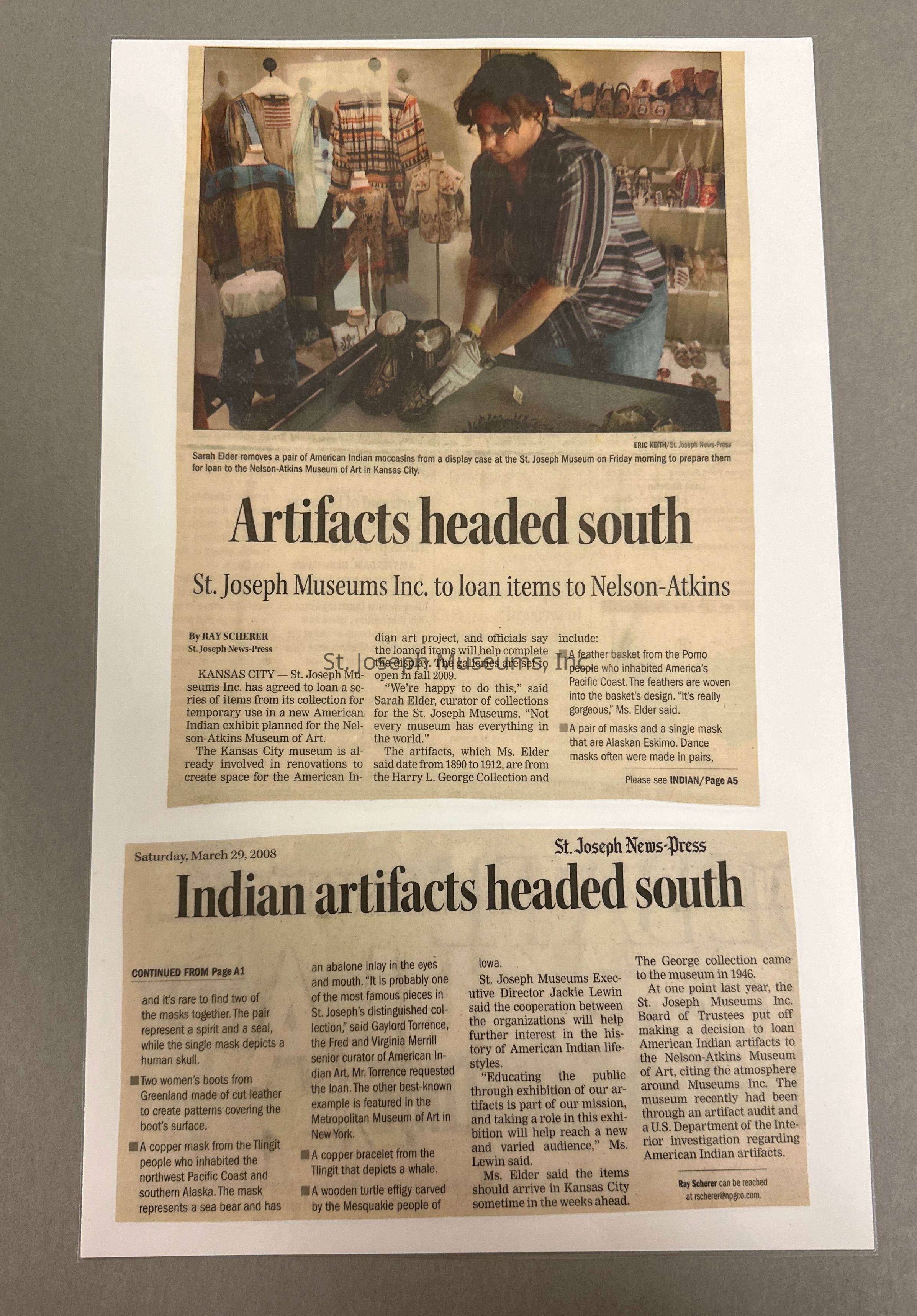 A laminated document containing two pieces of a St. Joseph News-Press article written by Ray Scherer about the St. Joseph Museum Indian artifacts. It is dated March 29, 2008.Context