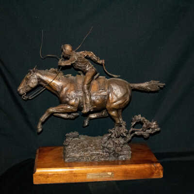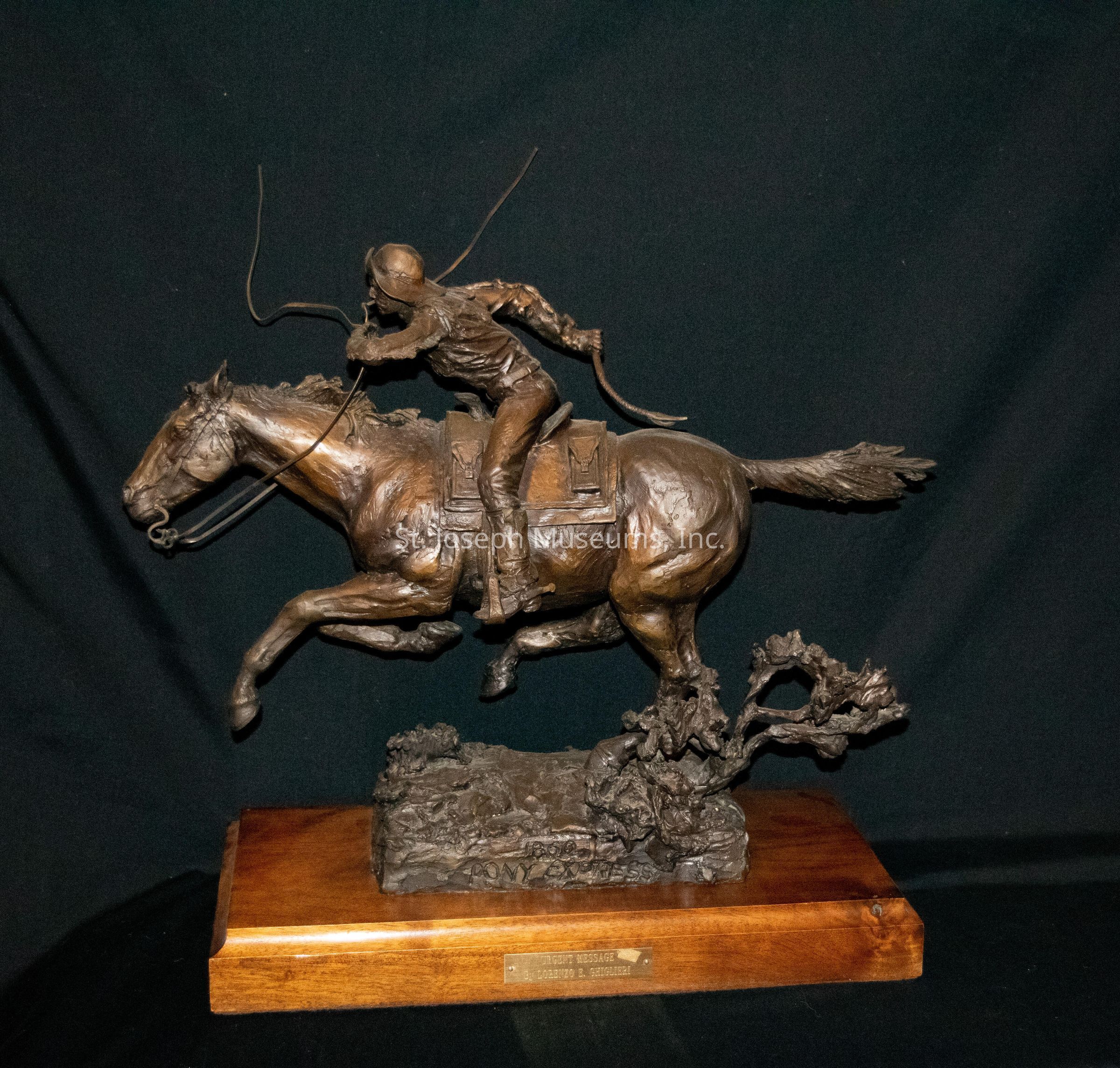 Statue/bronze/"Urgent Message"' artist: Lorenzo Ghiglieri /mounted on wood base (walnut)"1860 Pony Express" carved on front base of statue/horse, rider & trees/rider has pistol