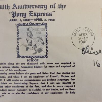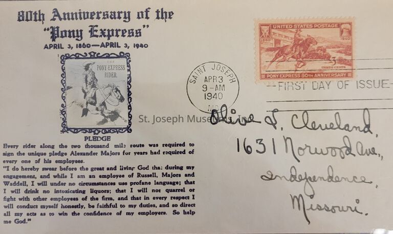 80th Anniversary of Pony Express: First Day Issue Envelope . Postmarked St. Joseph, Mo. 9 AM April 3, 1940. 3¢ stamp. Addressed to Olive L. Cleveland, 1631 Norwood Ave., Independence, Missouri.
