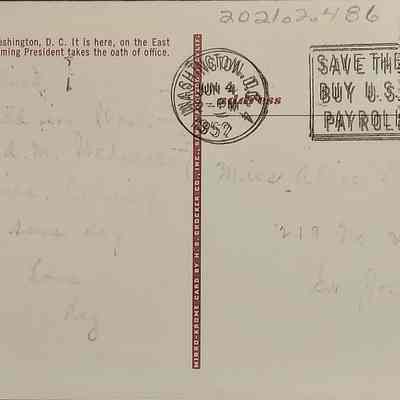 Handwritten postcard, from Ray to Miss Alice Denicke, 219 No 21st., St. Joseph, Mo. Postmarked Jun 4, 1952, Washington, D. C., postage 2¢. The front of the card is a colored photo of The U. S. Capitol, Washington, D. C. World's Only Corn Palace, Mitchell, South Dakota.Context