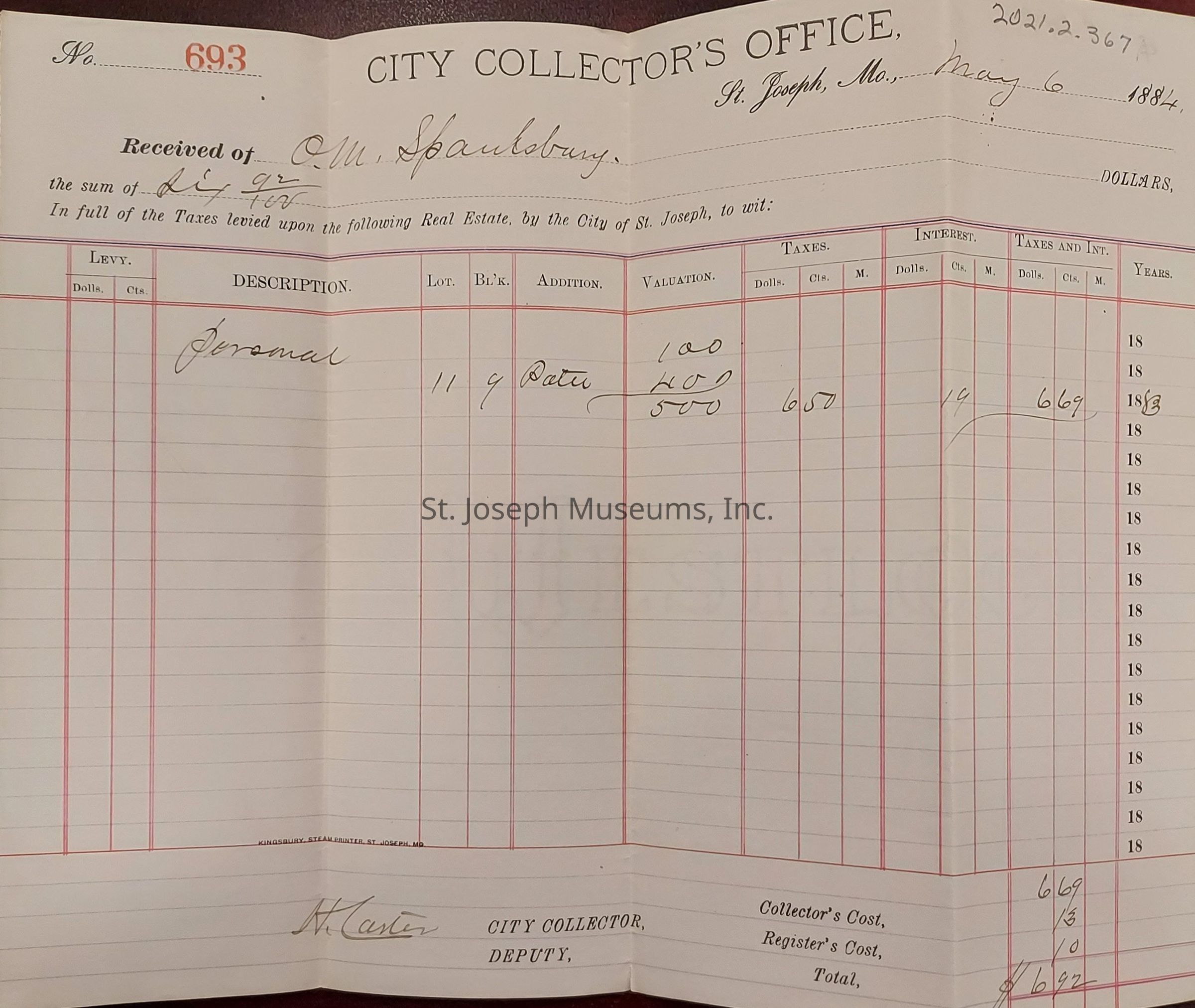 A) No. 693 City Collector's Office St. Joseph, Mo., May 6, 1884