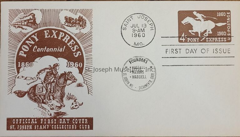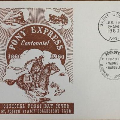 Pony Rider below galloping, whip behind, Circle above his head "Pony Express Centennial, 1860 1960" Starburst pattern around circle with illustration of locomotive in left upper corner and illustration of stage coach opposite. Below "Official First Day Cover, Sta. Joseph Stamp Collector's Club".Lexicon
