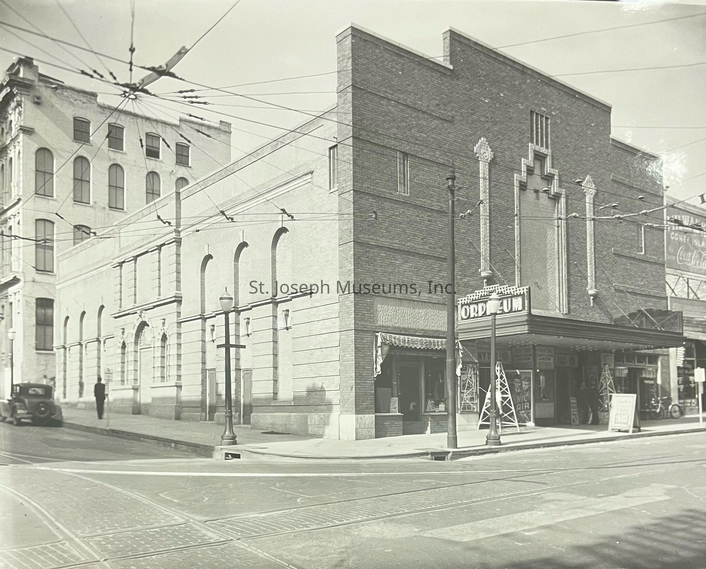 Black-and-white photograph depicting the exterior of the Orpheum Theater on Edmond Street, following reconstruction after a fire. The building shows distinct architectural details with large, ornate windows. A vintage car is parked nearby, next to a sign advertising events.
