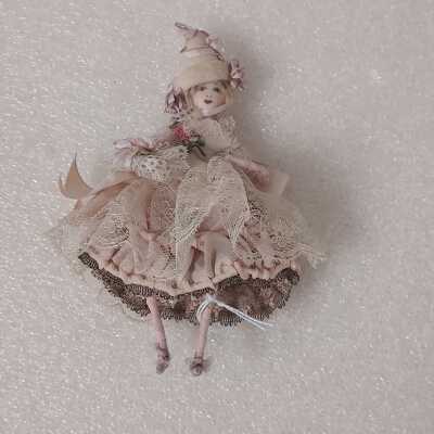 Six inch blonde French woman. Wearing a baby pink gown with ivory lace and pink rose embroidery. Includes one inch tall hat covered in pink and purple ribbon.