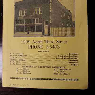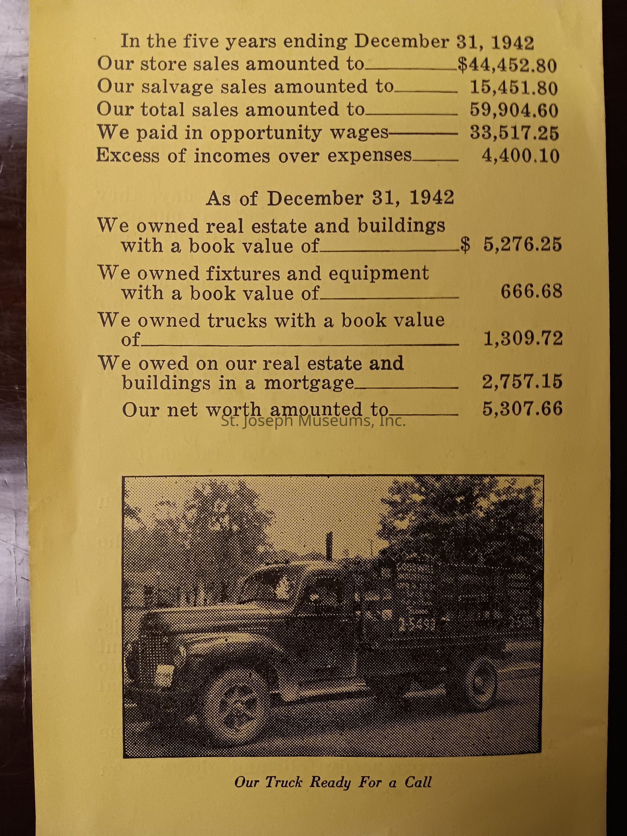 The back cover is an accounting of the five year period's store sales, salvage sales, total sales and net income after expenses. It goes on to list assets of real estate and buildings, fixtures and equipment, trucks book value minus liabilities owed and net worth.