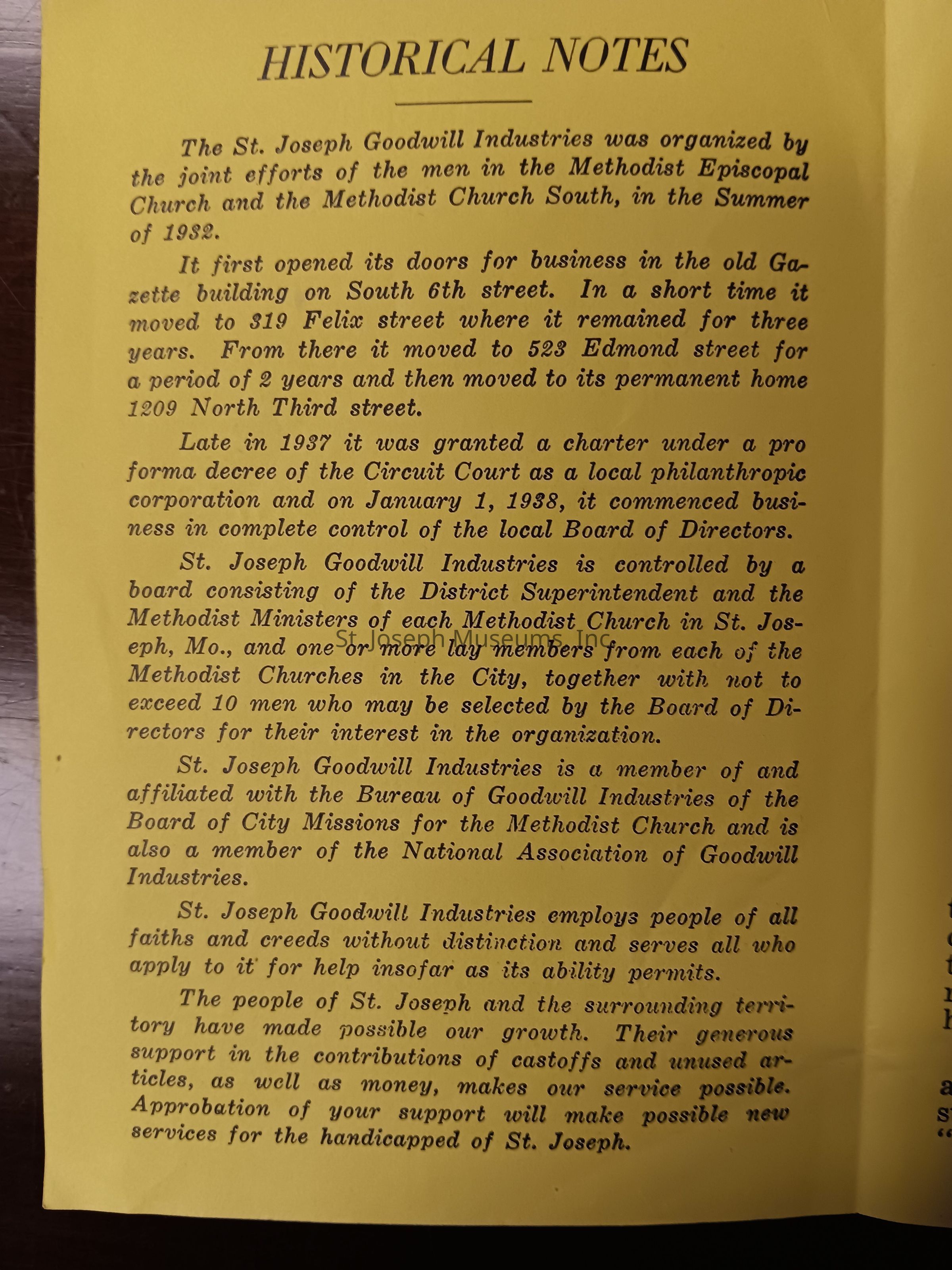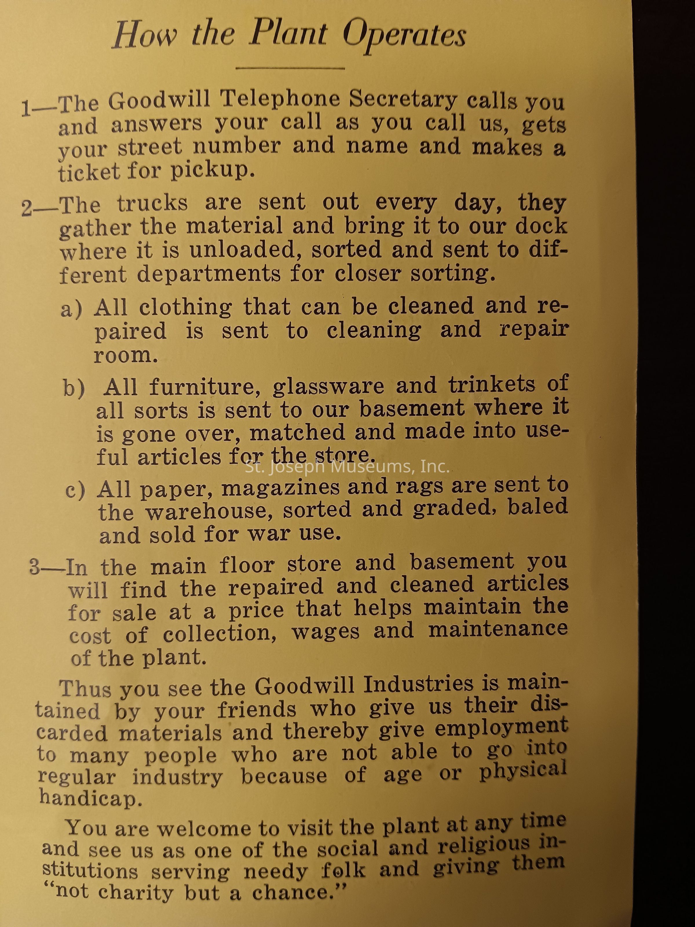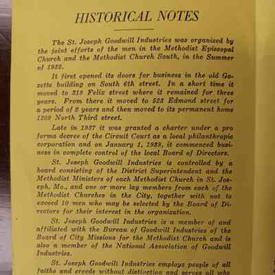 A yellow pamphlet folded to make four pages from the St. Joseph Goodwill IndustriesContext