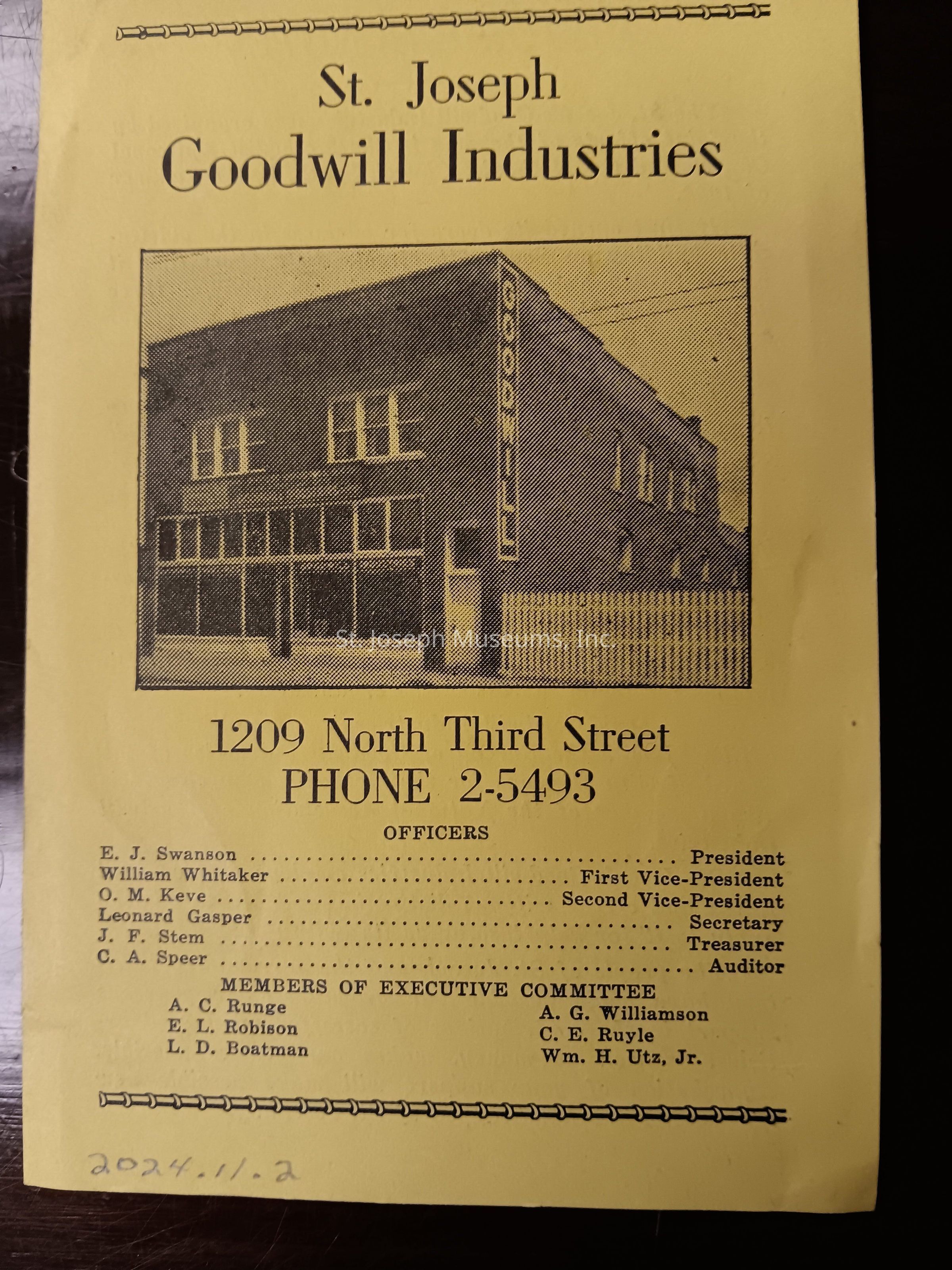 The front cover displays a photo of the Goodwill Industries building, its address and phone number. Additionally is the list of Officers names and position and Members Of The Executive Committee