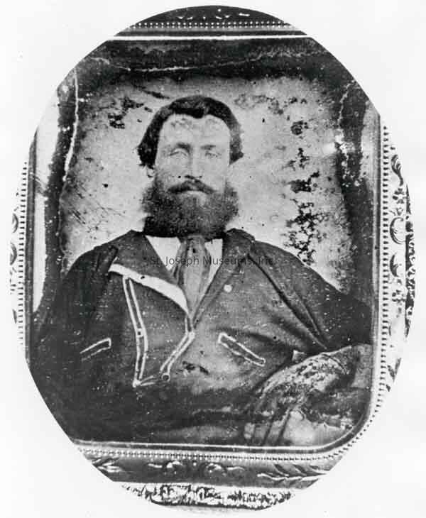 Robidoux (Andre) Descendant, Sophia Fiffe & husband, Eusebe, Portrait Photos (2), c. 1860. b/w. Photograph taken of a daguerreotype that had been in some stage of deterioration. Mature male with dark hair, dark beard & mustache. Head/shoulders pose, may be wearing Civil War uniform. as the coat has white edging about lapel and pockets. From "Descendants of Andre Robidoux File, Eusebe & Sophia Fiffe." (Extra unmarked copy of each photo in folder). Andre was the first Robidoux to North America from France and the Joseph Robidoux family is descended from him.