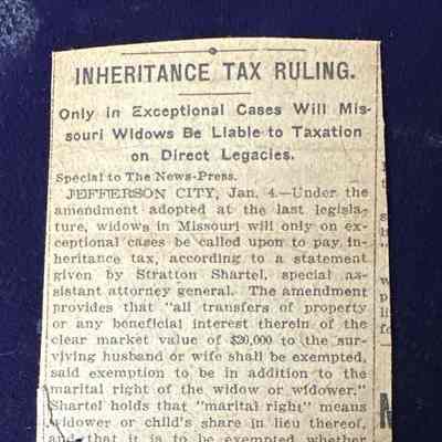 Newspaper clipping titled, “Inheritance Tax Ruling: Only in Exceptional Cases Will Missouri Widows be Liable to Taxation on Direct Legacies.”
