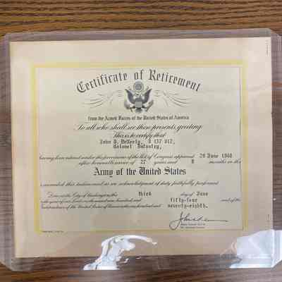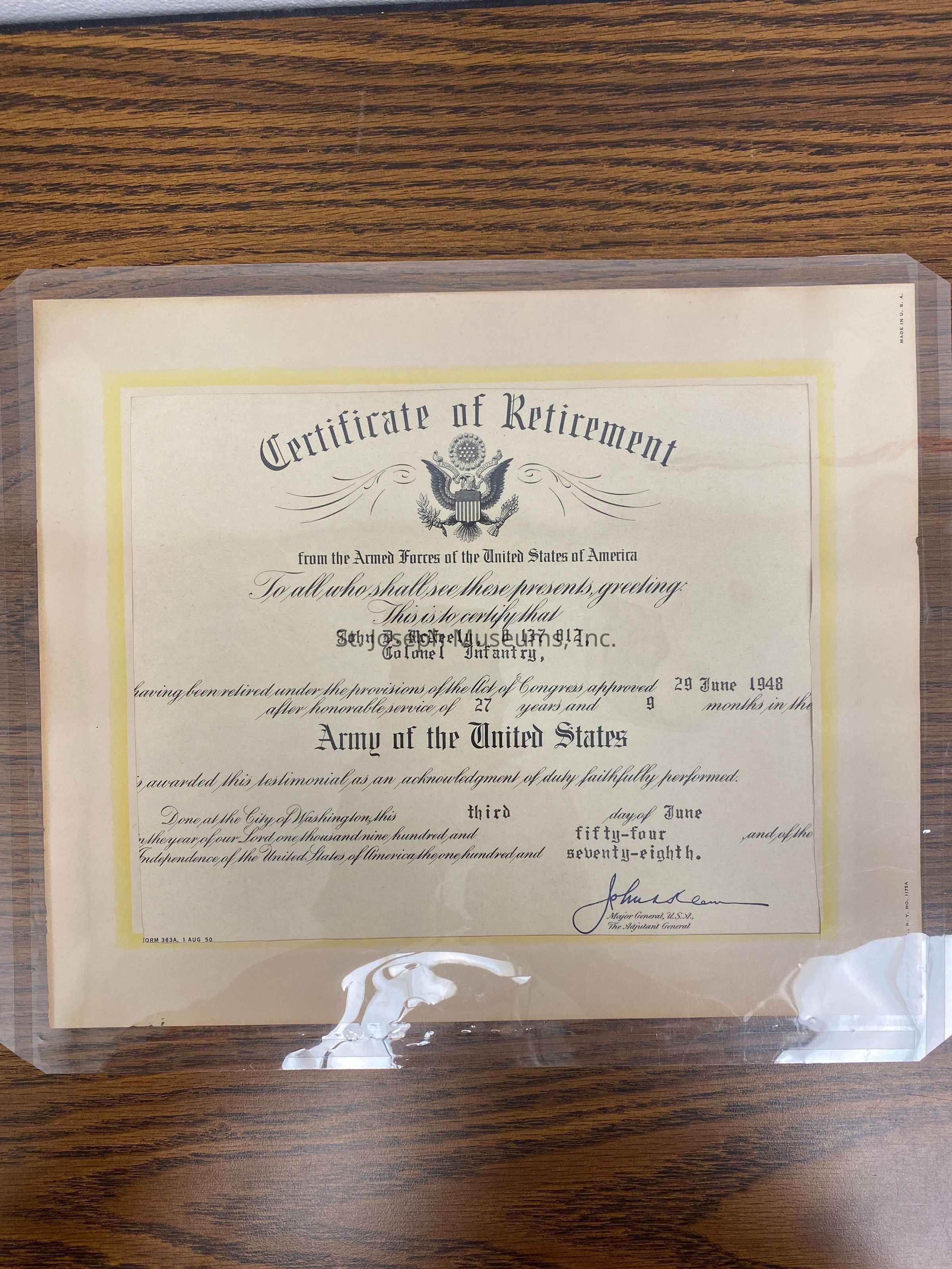 John D. McNeely, Military Retirement Certificate, 1948: John D. McNeely, 0 137 012 Colonel Infantry, Certificate of Retirement from the Armed Forces. Presented to him June 3, 1954. He served 27 years and 9 months. He retired under the provisions of the act of Congress approved June 29, 1948.Lexicon