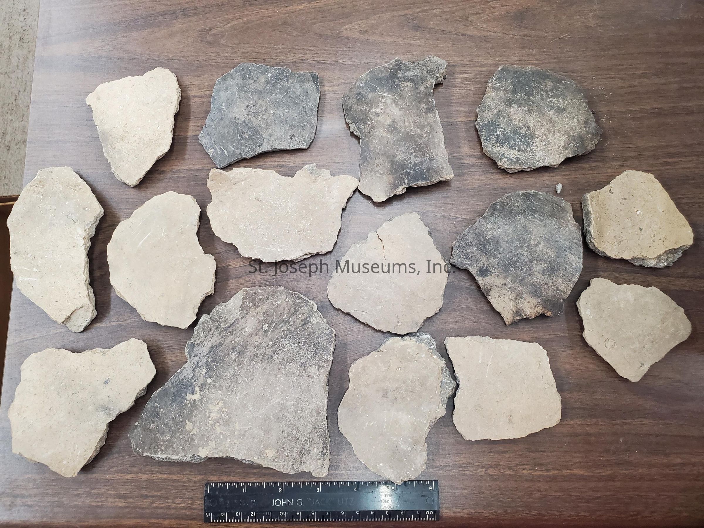 The image shows a collection of irregular pottery fragments displayed on a wooden surface with a ruler for scale.