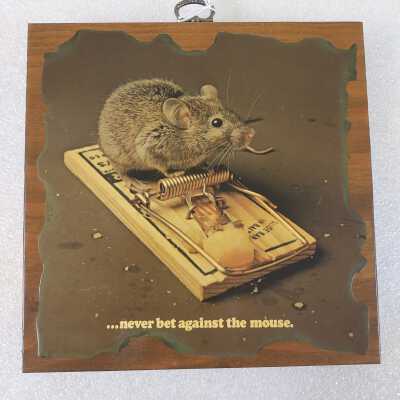 A wooden wall plaque with a picture of a Grey mouse standing on a mouse trap with the text at the bottom, "Never bet against the mouse"
