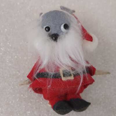 A grey mouse doll with googly eyes and a black nose. He is wearing a red Santa coat and hat and has grey felt ears and a white yarn beard.