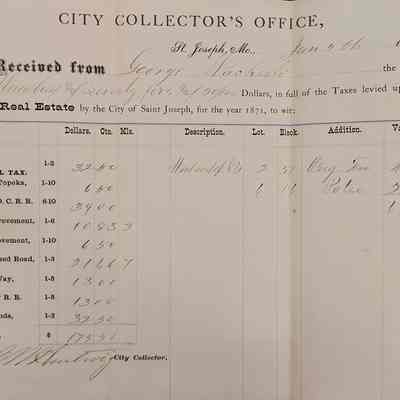 A tri-folded Tax Receipts for George Wackerli. The document is on City Collector's Office, St Joseph, Mo., receipt and signed by (illegible) City Collector. It is dated Jan. 5th, 1872. The upper left hand corner provides the Tax Levy schedule. The middle section of the back side is printed "City Tax Receipt 1900" and includes a NOTICE from the Treasurer.Context