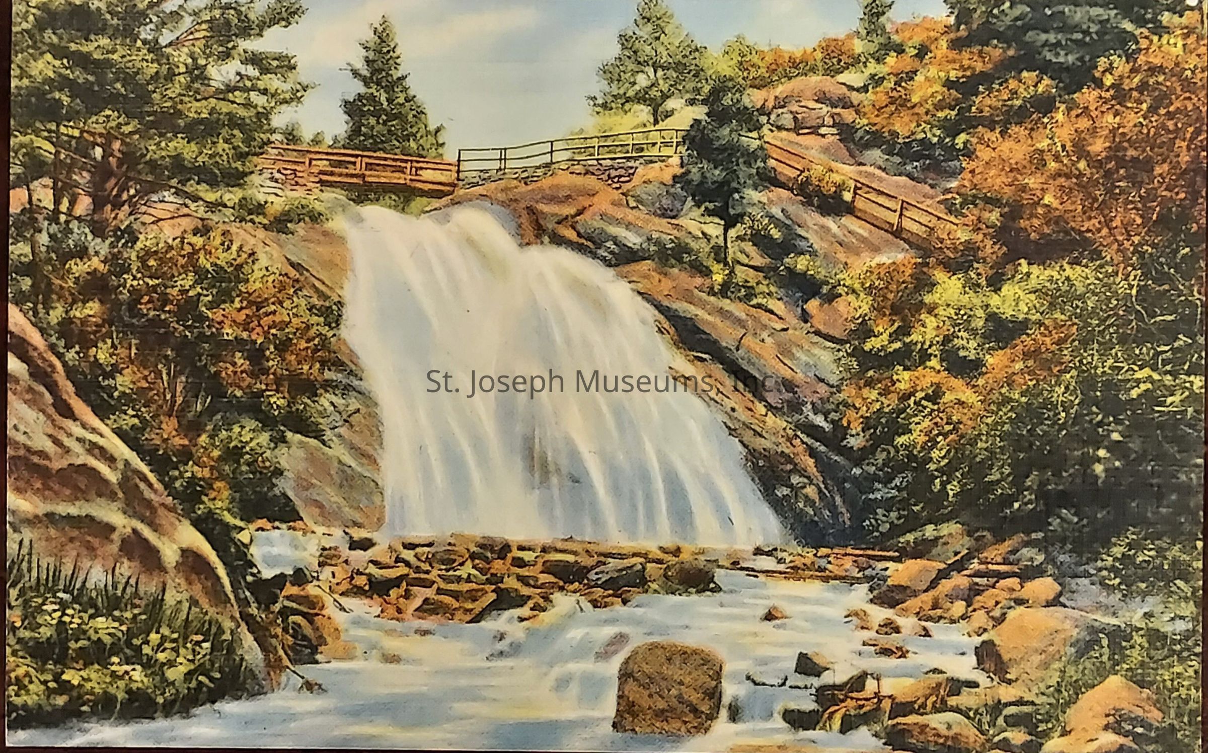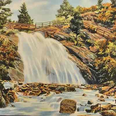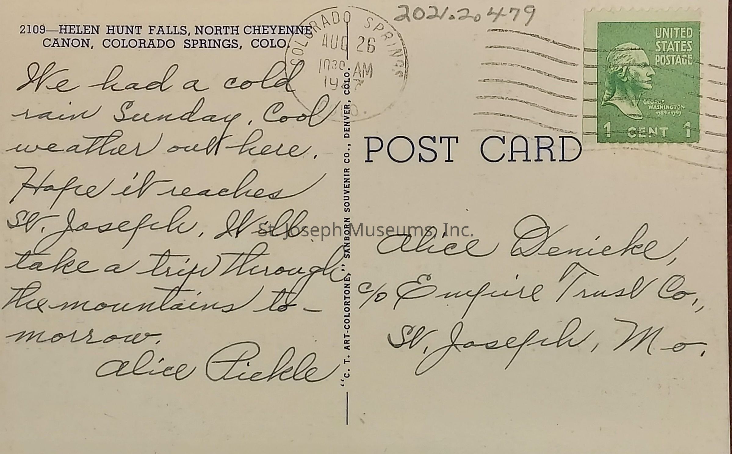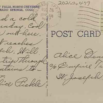 Handwritten postcard, from Alice Pickle to Alice Denicke, c/o Empire Trust Co, St. Joseph, Mo., postmarked Aug 26 1947, Colorado Springs, Colo., postage 1¢ stamp. The front of the card is a colored drawing of Helen Hunt Falls, North Cheyenne Canon, Colorado Springs, Colo.