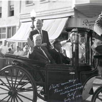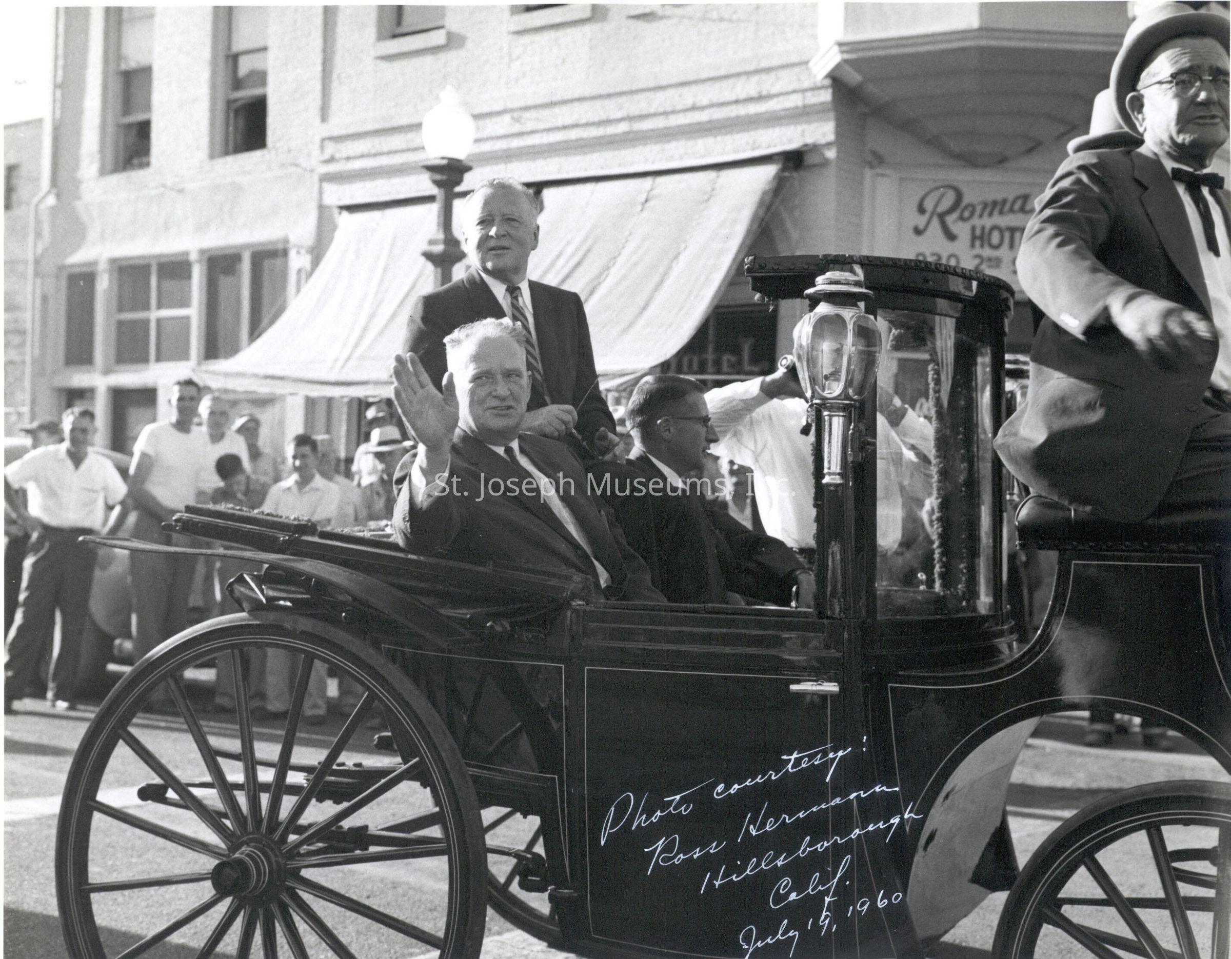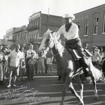 Pony Express Centennial, Sacramento, CA, Photos (3), 1960. b/w. Three photos provided in Don Reynolds at St. Joseph Museum by Ross Hermann, Hillsborough, CA. (The actual photos, if they existed, were not numbered and were not located in 2020) "Photo courtesy of Ross Hermann, Hillsborough, Calif. July 19, 1960" written in white at edge of photos.
