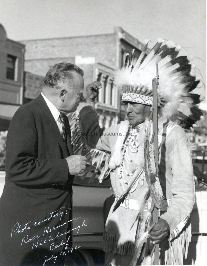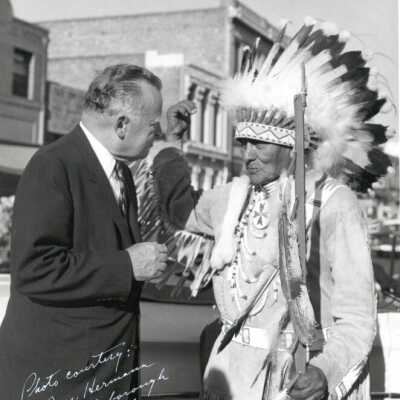 97.1P.1396C = Man in business suit talking with Native American in native costume with full headdress. Appears to be taken on street in Old Town.Made/Created