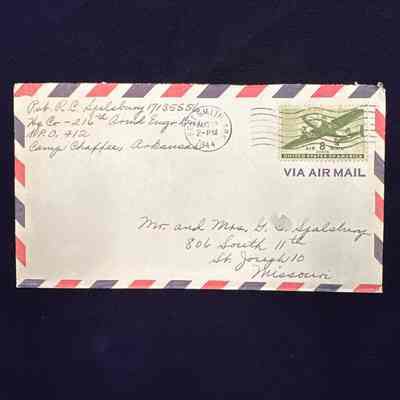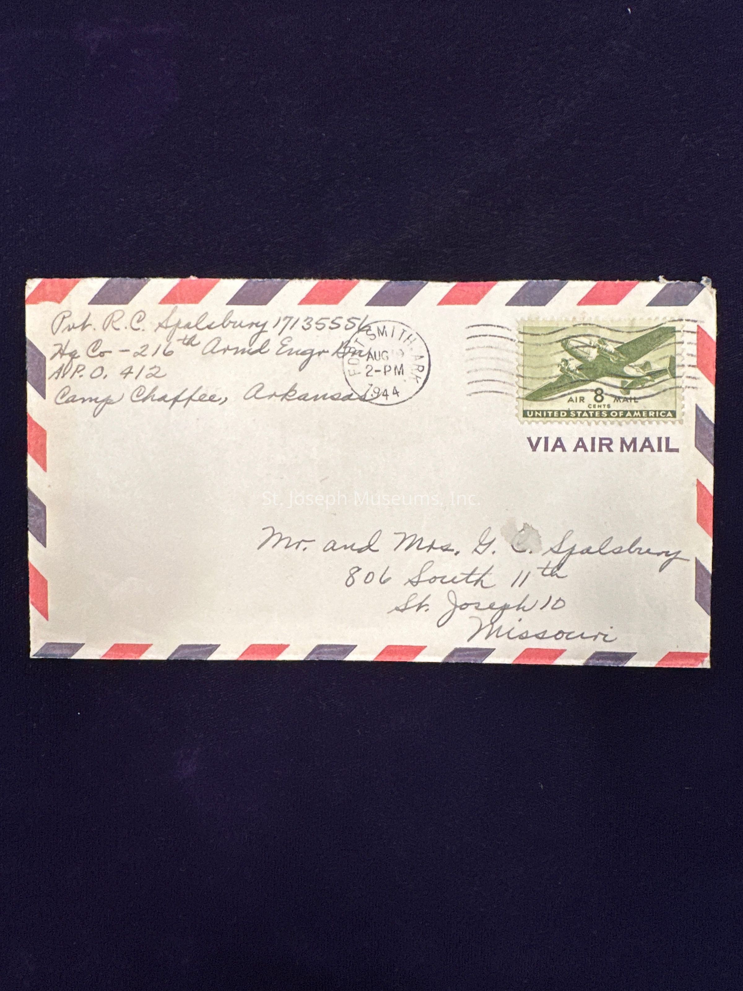 Letter Home from Pvt. R. C. Spalsbury, 17135556, Hq Co - 216th Armd Engr Bn, A.P.O. 412, Camp Chaffee, Arkansas to his parents Mr. and Mrs. G. C. Spalsbury, 806 South 11th, St. Joseph (10), Missouri. Post Marked AUG 19, 1944, 2 PM, Fort Smith, Ark., 8 cents Air Mail stampDescription