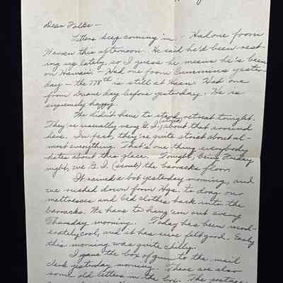 Letters keep coming in. -Had one from Warren this afternoon. He said he'd been resting up lately, so I guess he means he's been on Hawaii. - Had one from Cummins yesterday - the 778th is still at Haan. Had one from Duane day before yesterday. He is supremely happy.