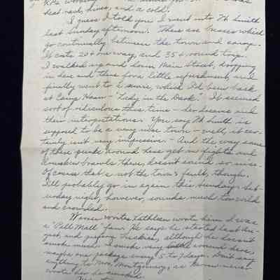 This letter is only one page, front and back, written in blue ink on plain stationery. The page is folded in half then again in thirds. The envelope has red and blue hash marks around the edge.Dimensions
