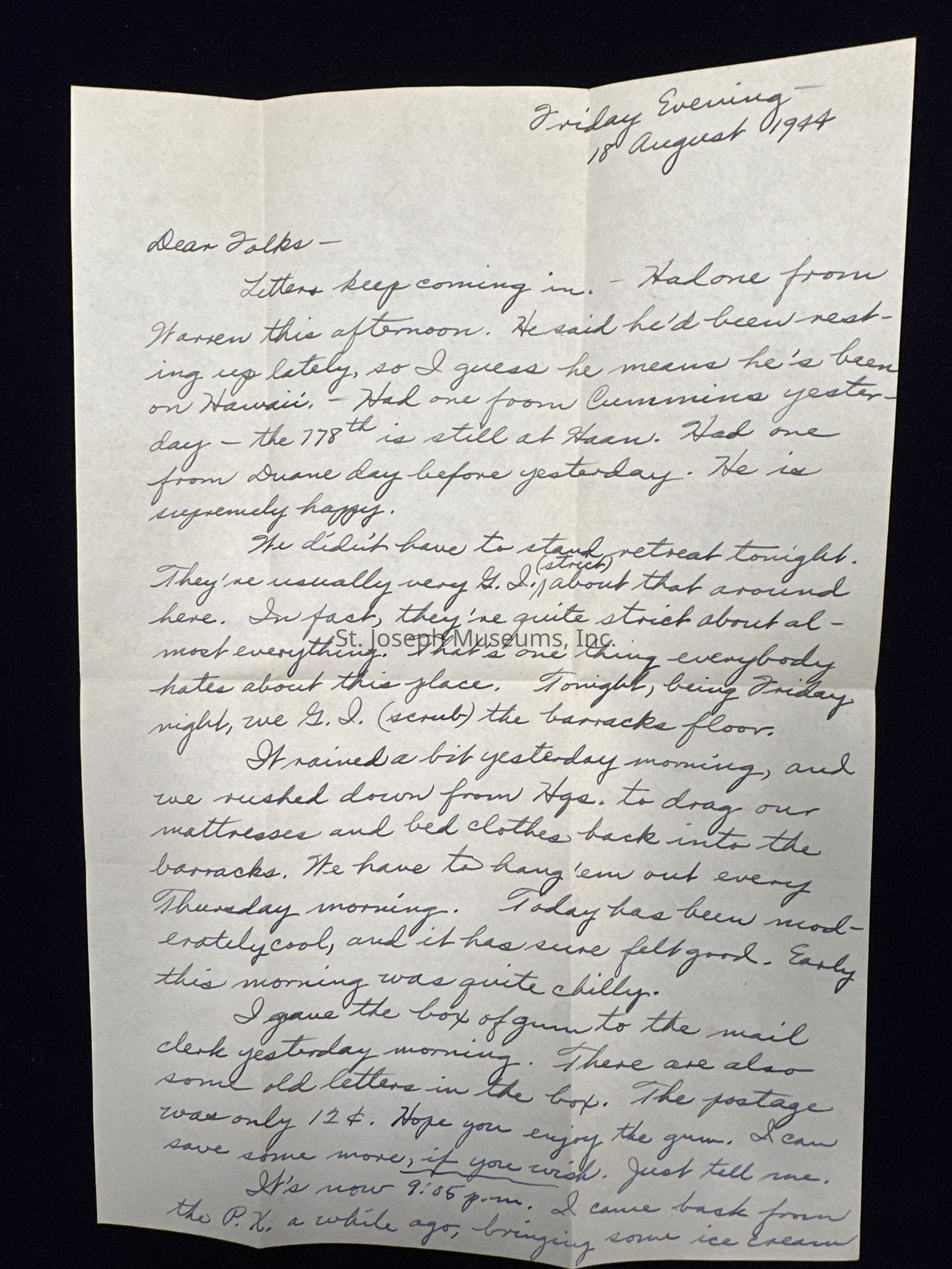 Handwritten letter home to parents back in St. Joseph after being called up to serve in the US Army during WWII. Pvt. Spalsbury, at the time of this letter, has completed Basic Training at Camp Callan, California, was stationed for a short time with a STAR Unit for ASTP (Army Specialized Training Program) soldiers in Pasadena, CA then moved to engineering training at Loyola University in Los Angeles, CA. After flunking out of the ASTP program, Robert was briefly stationed at Camp Roberts, located in central California assigned to the Infantry Replacement Training Center. Then Robert was stationed at Camp Haan in southern California, a U.S. Army training camp for Coast Artillery Anti Aircraft gunners. During his time at Camp Haan, Robert was transferred from Battery B to Battery A and began working as an office Clerk in Battery A.