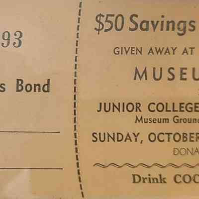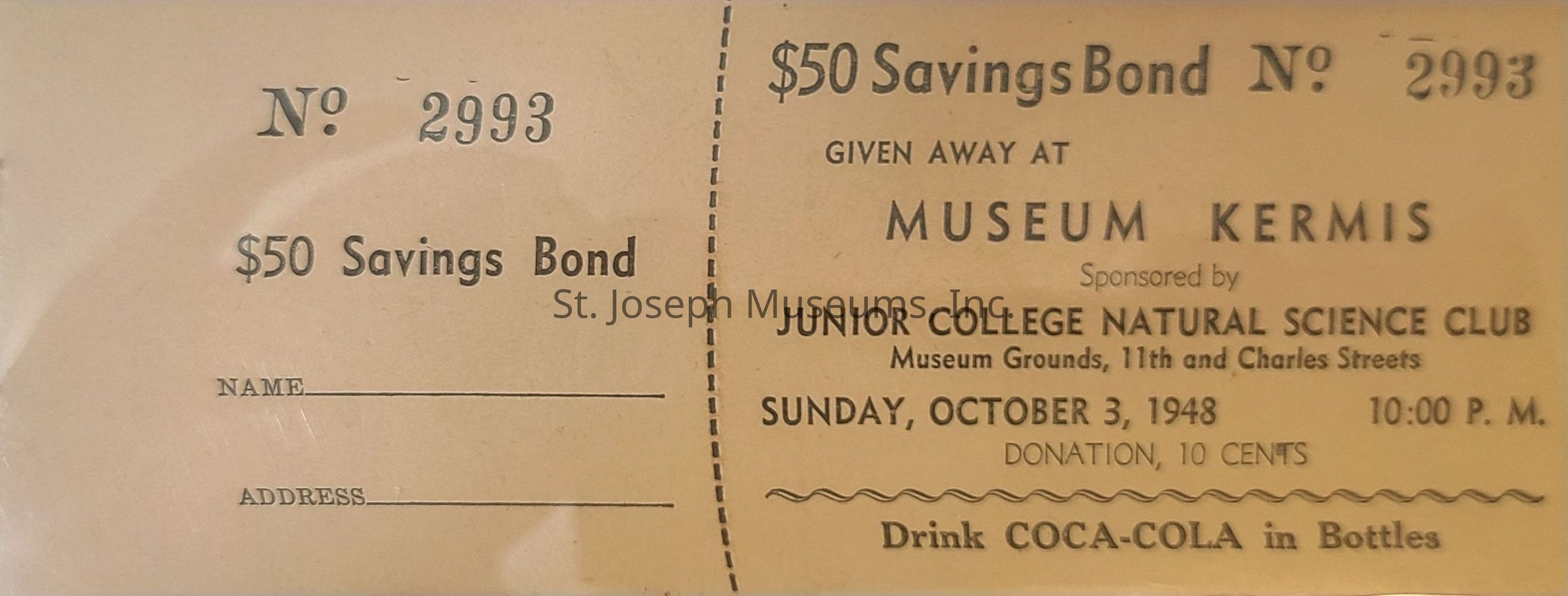 Raffle Ticket Book for Savings Bond $50 Given Away At Museum Kermis. Sponsored by Junior College Natural Science Club located at 11th and Charles Streets. The date is Sunday October 3, 1948 at 10:00 P. M. Donation is 10 cents . Ticket number is 2993.Lexicon