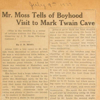 Newspaper article on Mark Twain Cave by J.B. MossEntry/Object ID