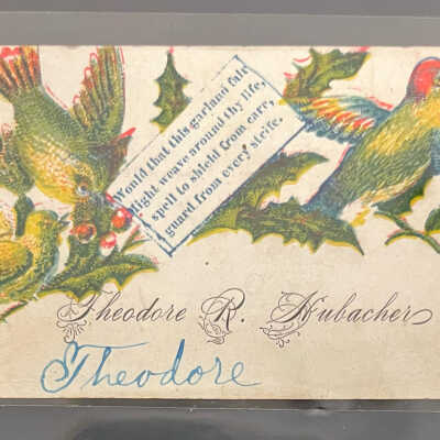 Theodore R. Hubacher calling card has his name printed on card and also handwritten. The card has birds on it. Date unknown.