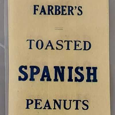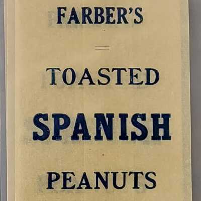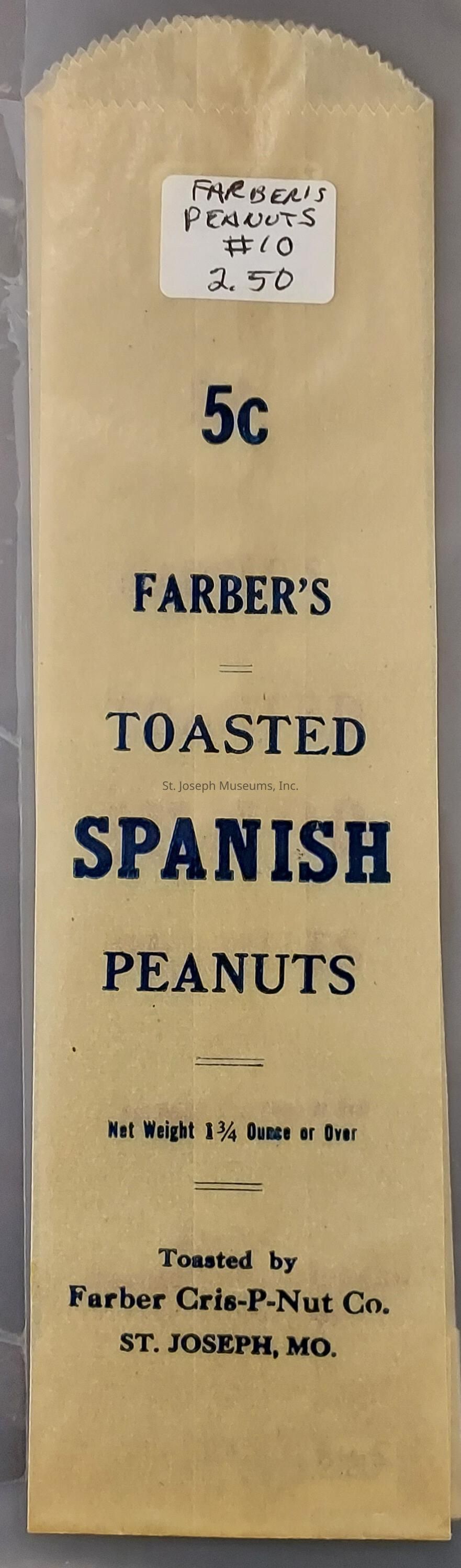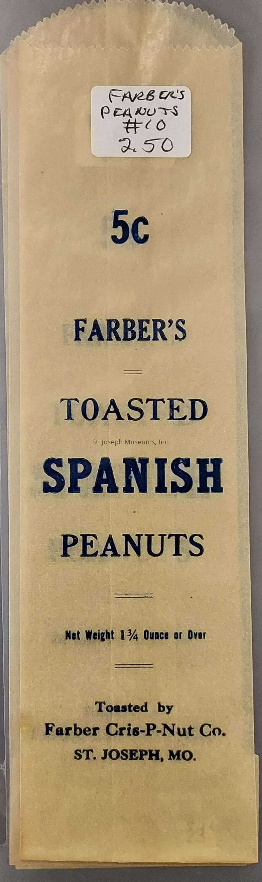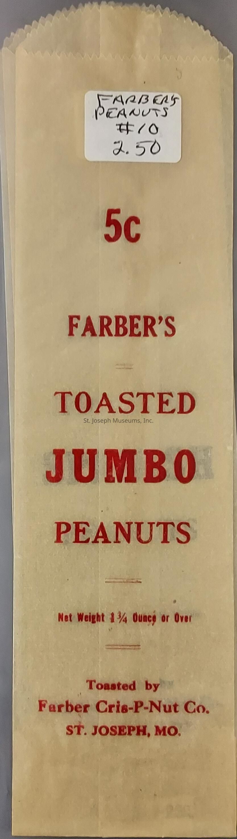Farber Cris-P-Nut Co. Toasted Jumbo Peanuts Bags, c. 1900. Three glassine bags (tan), printed in red, "5c Farbers's Toasted Jumbo Peanuts, Net weight 1¼ ounce or over. Toasted by Farber Cris-P-Nut Co., St. Joseph, MO"Collection
