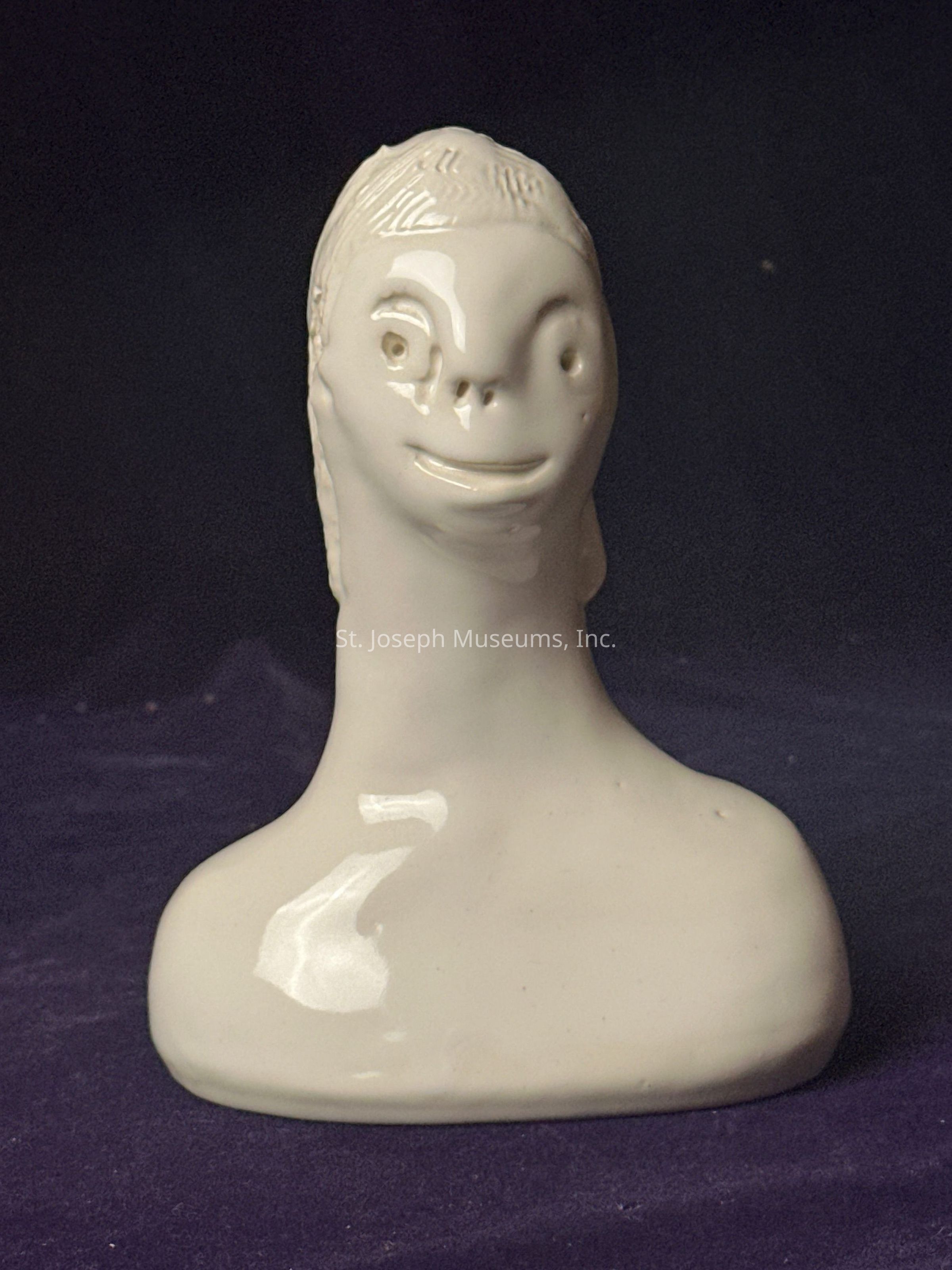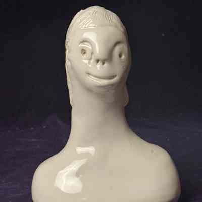White vase in the shape of a figure with a long neck created by the artist Don Beaulieu.(bow-lyoo)Context