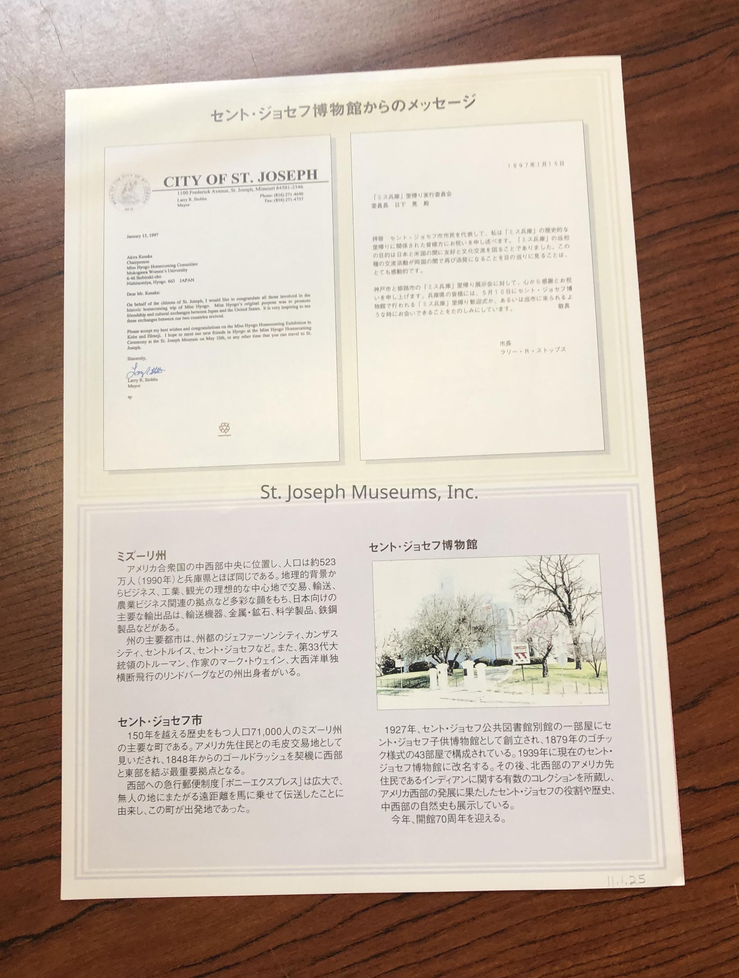 Hyogo, Miss - A Journey of Friendship is a program written primarily in Japanese. The program includes pictures of Miss Hyogo and it is assumed the others dolls pictured are the friendship dolls sent to Japan in 1927 by Dr. Sidney L. Gulick. In response to Dr. Gulick's dolls, the Japanese started a similar program. Their "Dolls of Gratitude" were sent to the United States. The dolls were given permanent homes throughout the United States. Miss Hyogo came to the Children's Museum of St. Joseph (in 1939 the name was changed to St. Joseph Museum. The friendship doll exchange was rekindled with the visit of Miss Hyogo to her homeland in March and April 1997. The program includes a letter from the Mayor of St. Joseph, Larry R. Stobbs to Akira Kusaka, Chairperson of the Miss Hyogo Homecoming Committee in Japan.Lexicon