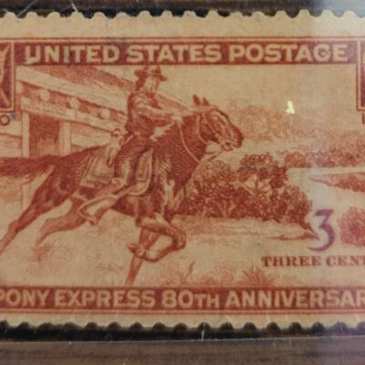 Pony Express 80th Anniversary 1860-1940. The stamp is 3 cents and shows picture of rider leaving stable. The stamp is reddish brown on white and is uncancelled. Date 1940.