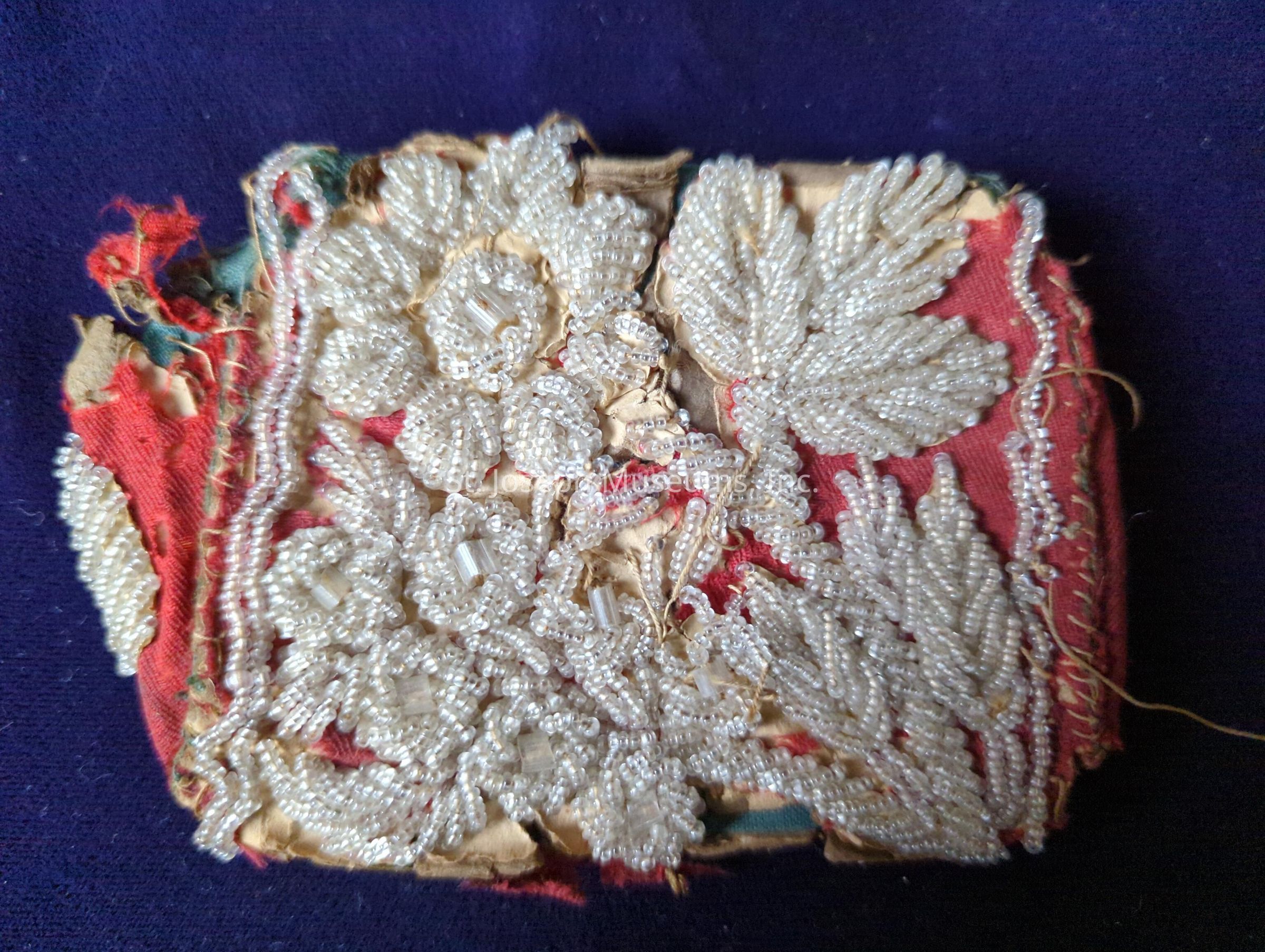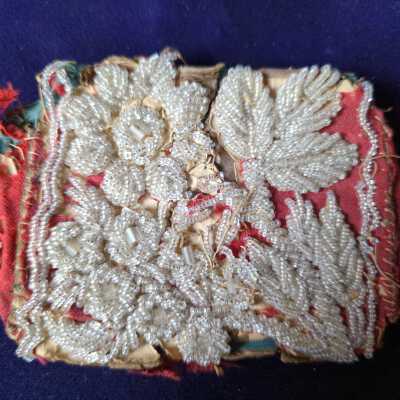 SMALL/RED/WHITE/FLORAL DES./GREEN LINING/FLAP CLOSURE WITH HOOK & EYE/EYE IS MISSING/POOR CONDITION/"IOWA INDIANS"