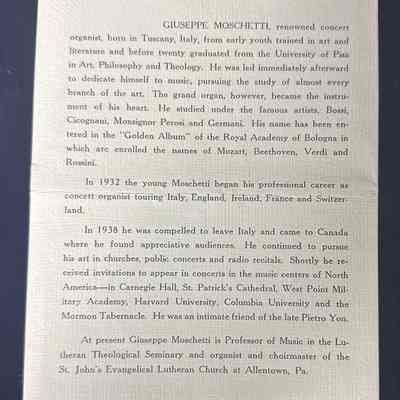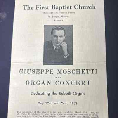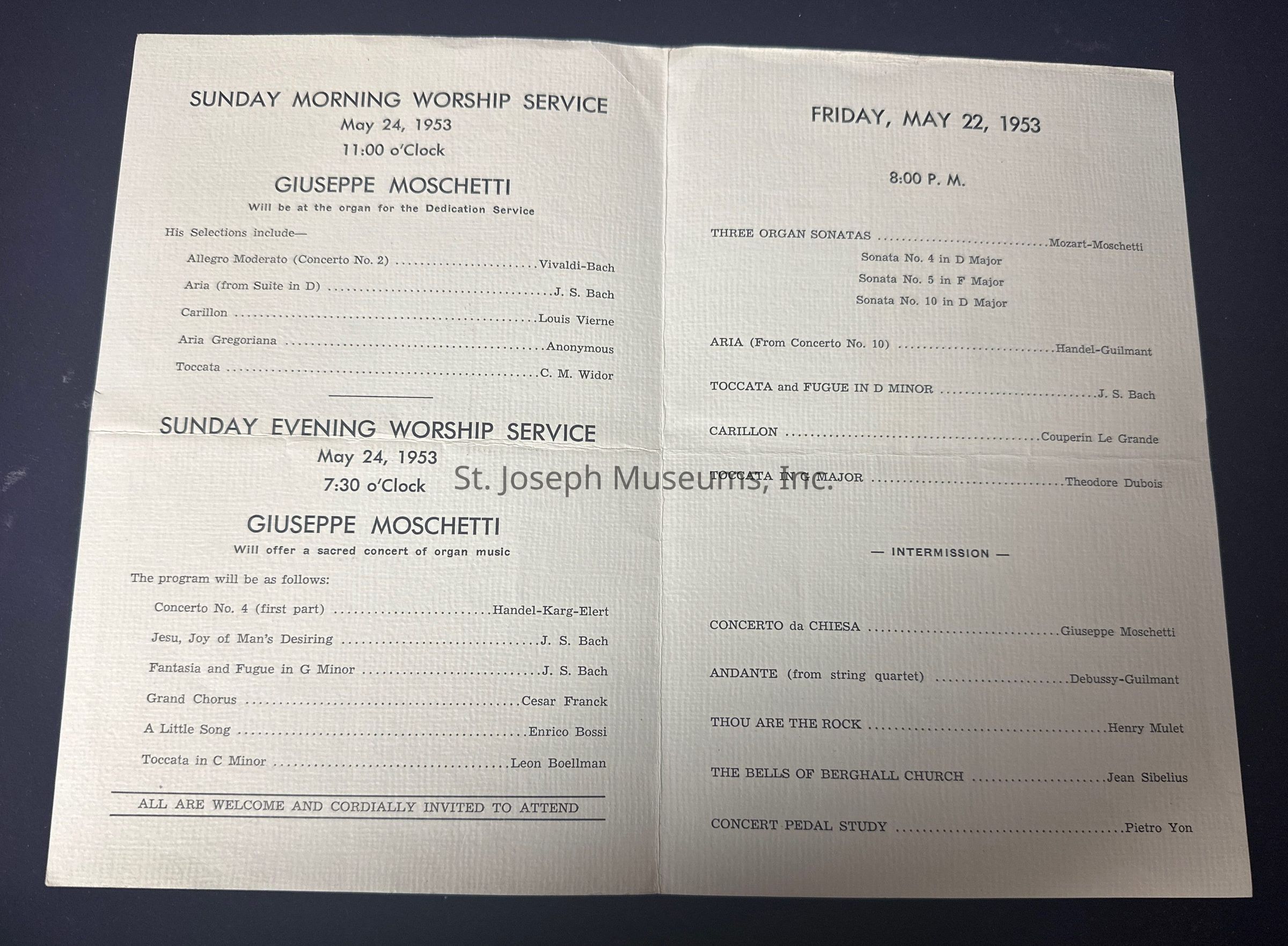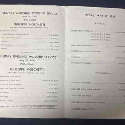 Pamphlet of a Giuseppe Moschetti organ concert dates May 22 and 24, 1953 at First Baptist Church celebrating the rebuilding of the church organ.Collection