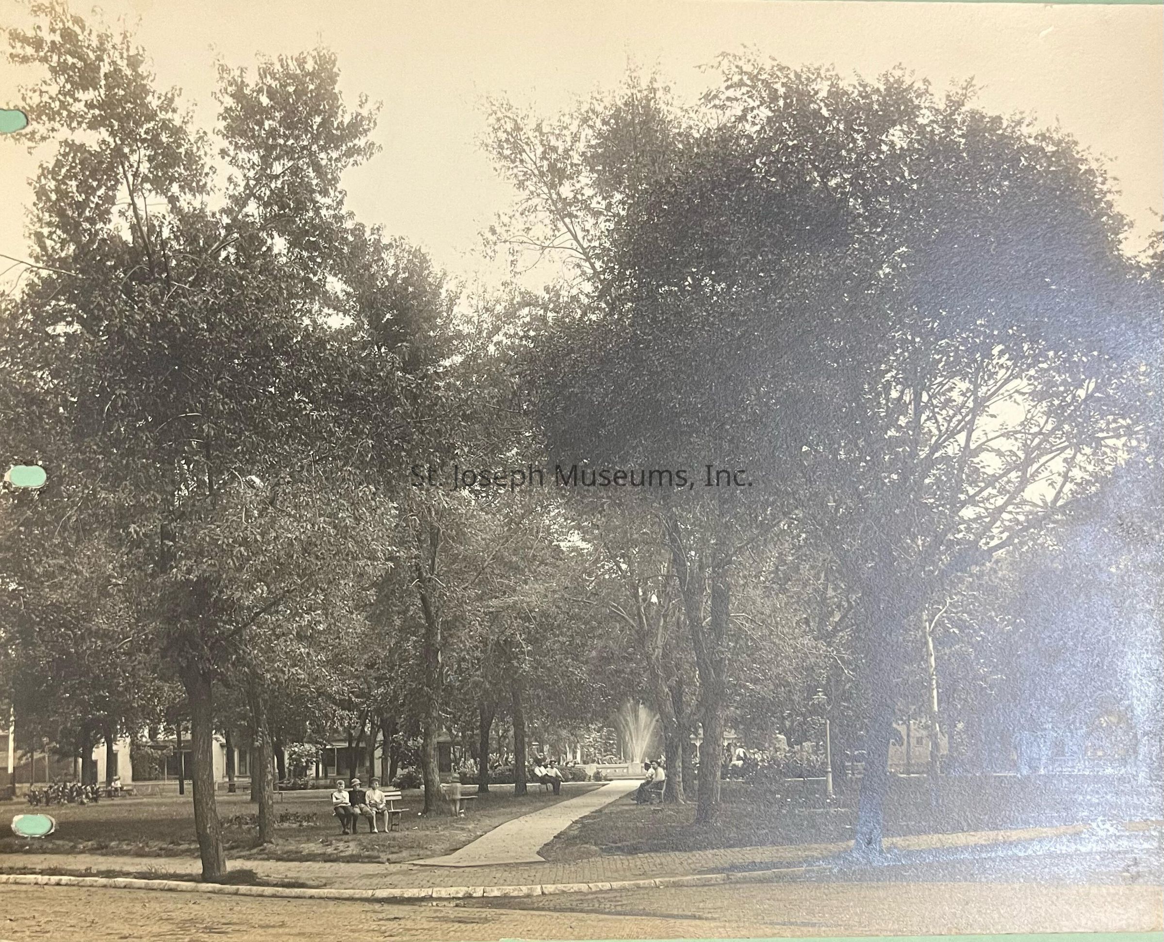 Sepia image showcasing a serene scene at Mitchell Park, located between South 10th and South 11th, featuring a pathway lined with trees and benches, where several people are relaxing and enjoying the shaded environment.