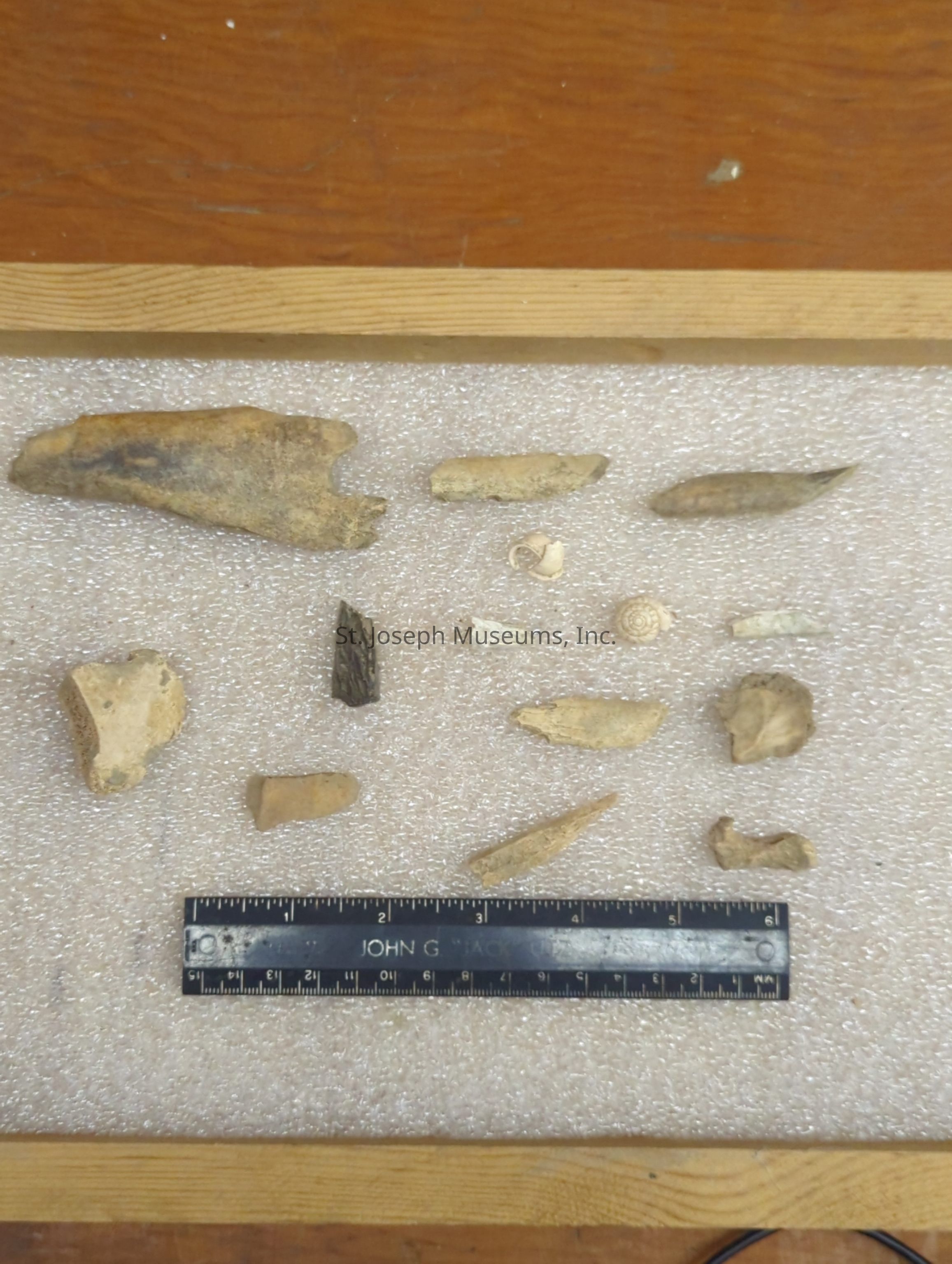 23BN1 Sq HHH Level 9, 48"-54" Bone fragments and shell fragments Kept in a box that reads: Fauna - Identified - Sq HHH Note in box reads: Square HHH, Occupation to 60 inches. Trade items to 30 items