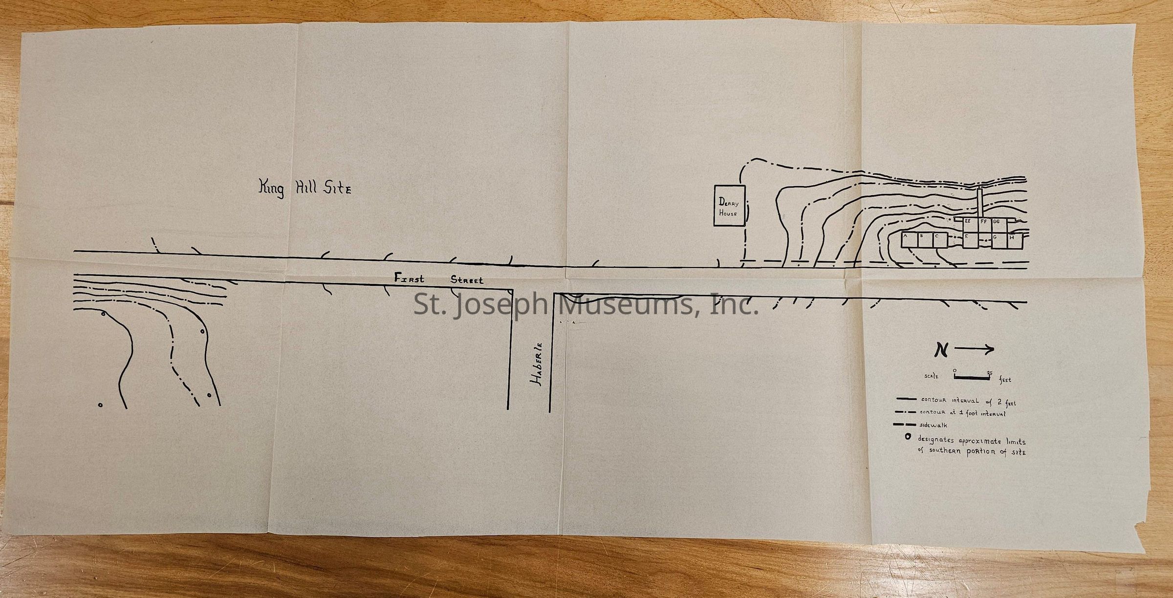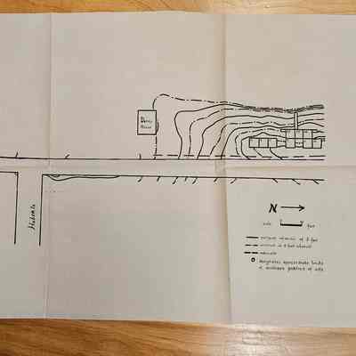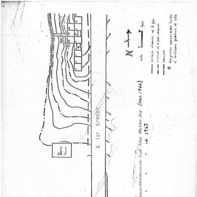 The image depicts a hand-drawn map labeled "Dairy House" situated alongside "S. 1st Street," illustrated with contour lines indicating elevation differences at 2-foot and 4-foot intervals. The map includes a section marked with approximate limits of the southern portion of the site, accompanied by a north directional arrow and a scale in feet. Several rectangular plots are outlined and labeled with letters or numbers, indicating specific areas within the site.