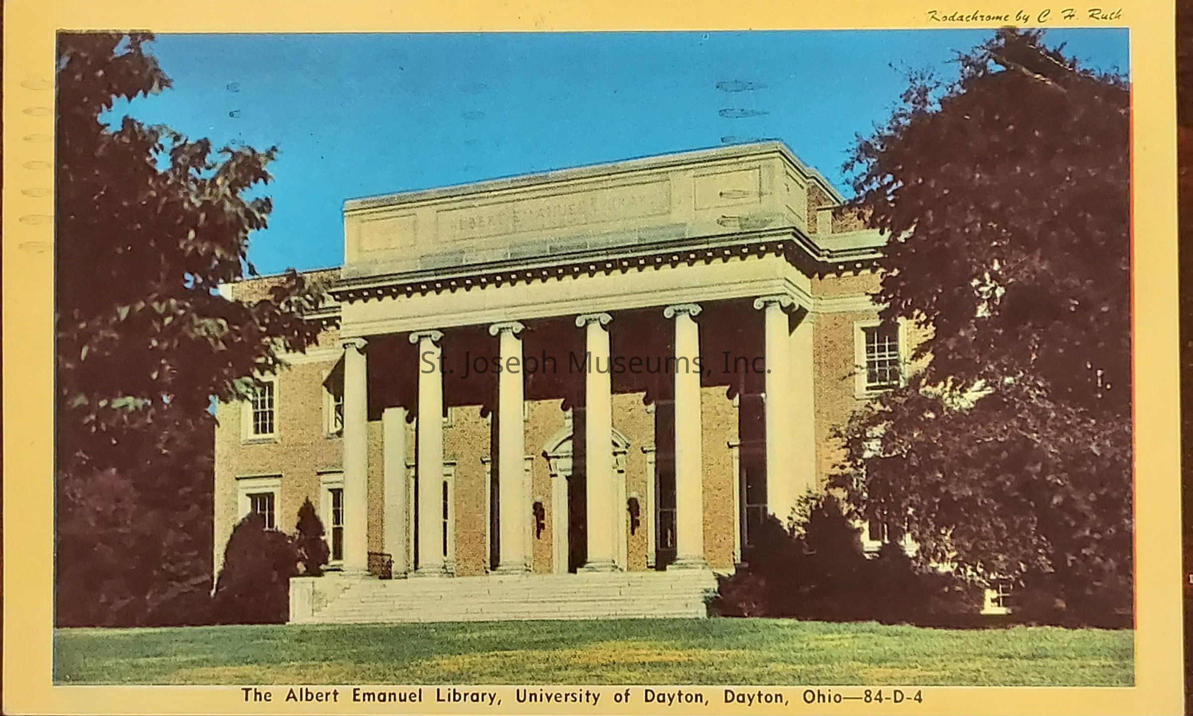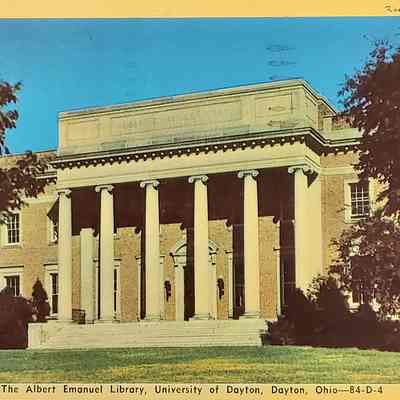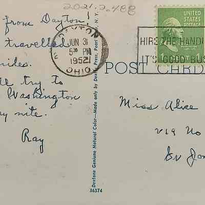 Handwritten postcard, from Ray to Miss Alice Denicke, 219 No 21 S., St. Joseph, Mo. Postmarked Jun 3, 1952, New York, N.Y., postage 2 - 1¢ stamps. The front of the card is a colored picture of The Albert Emanuel Library, University of Dayton, Dayton, Ohio..Context