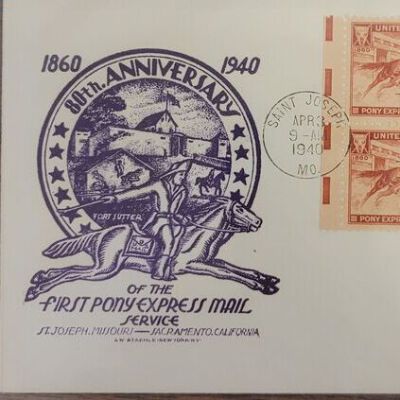 Pony Express 80th Anniversary First Day Cover, St. Joseph, MO, Apr. 3, 1940. First Day issue of commemorative envelope "First Day Issue". with four 3¢ commemorative stamps. Postmarked Saint Joseph, MO, 9 AM, April 3, 1940. unaddressed.